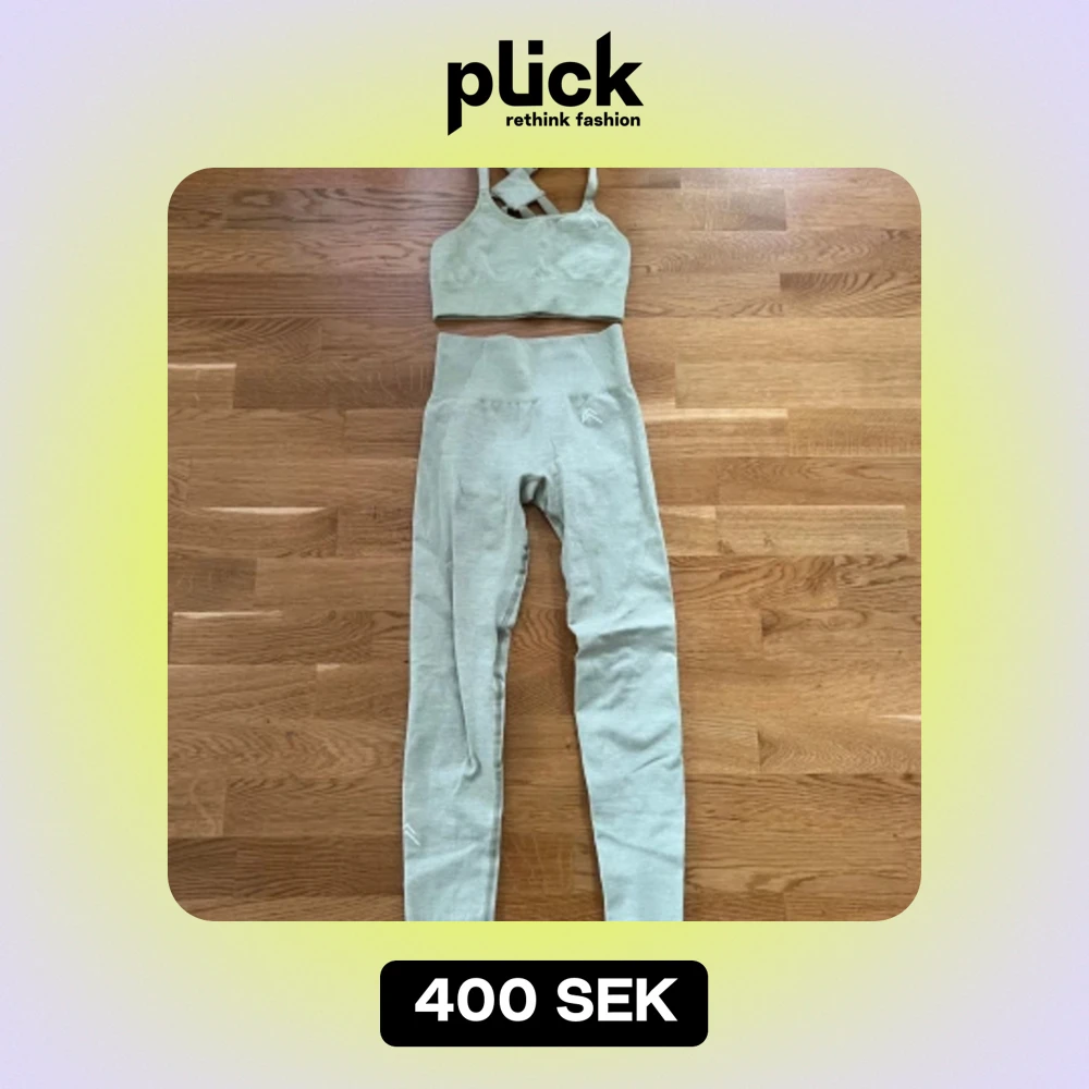 Träningsset från Oner Active i ljusgrön färg. Inga inlägg i sport-bh:n och lite färgad på insidan samt lite skavanker baktill på tightsen och sprucket märke. Annars fint skick! Long lenght på tightsen.