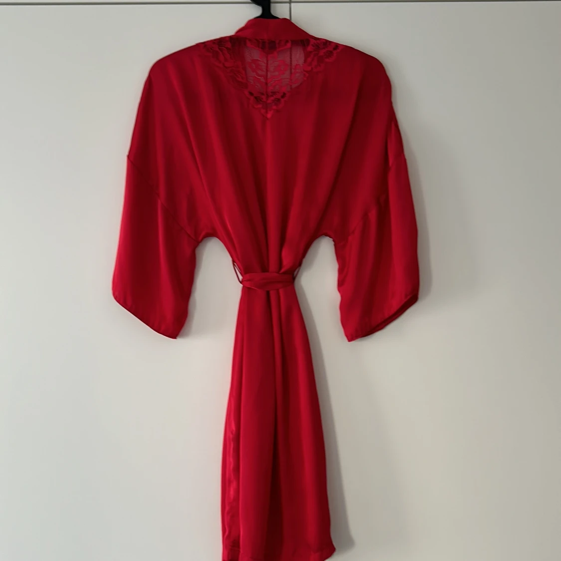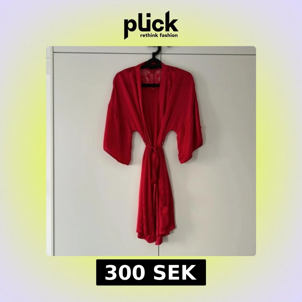 Röd kort kimono från Charade by Change Lingerie i glansigt material med spetsdetaljer upptill, knytband i midjan och söt liten rosett på sidan. Perfekt för dig som vill ha något extra snyggt och bekvämt. Ordinarie 999kr, pris 300kr