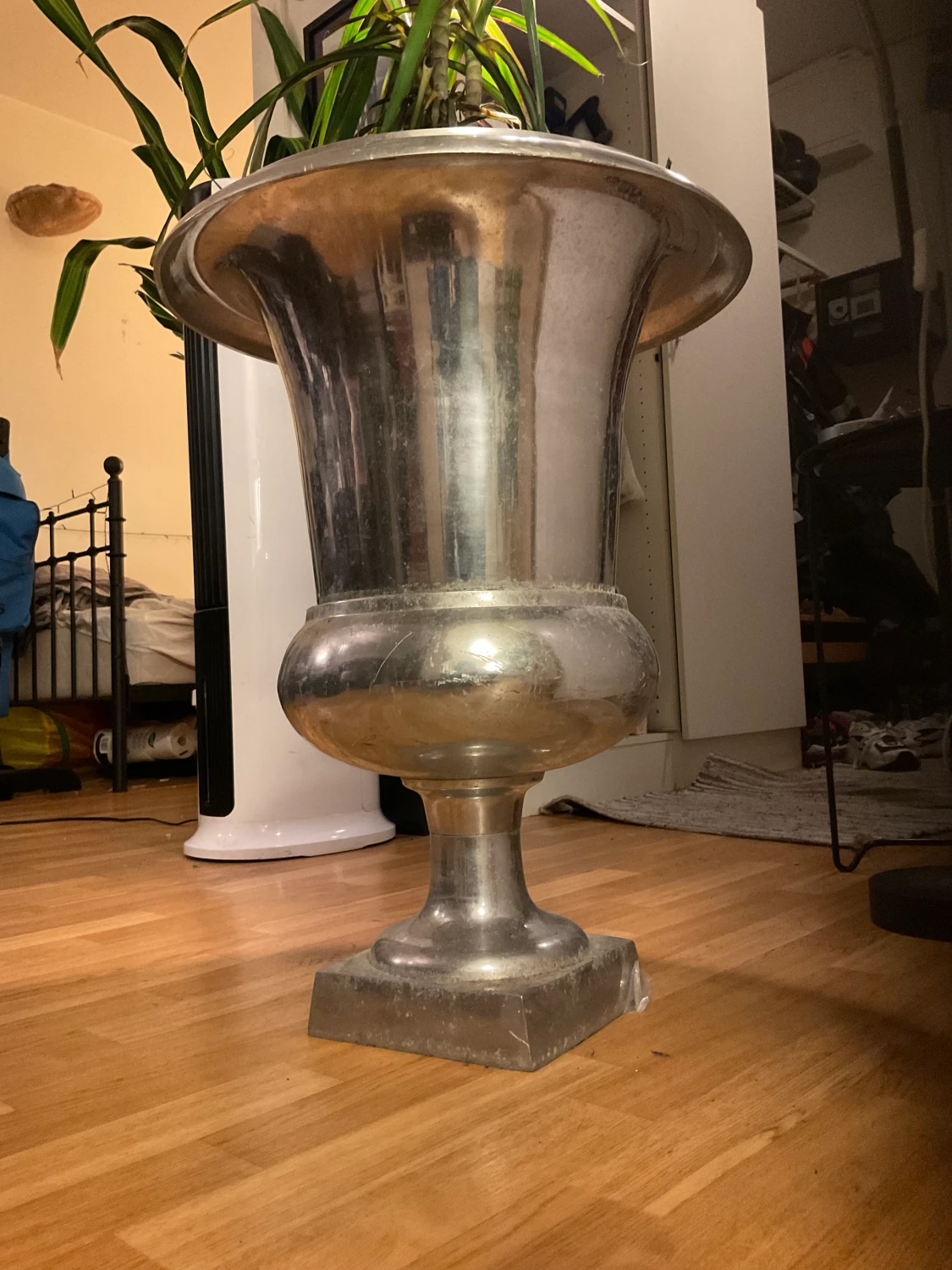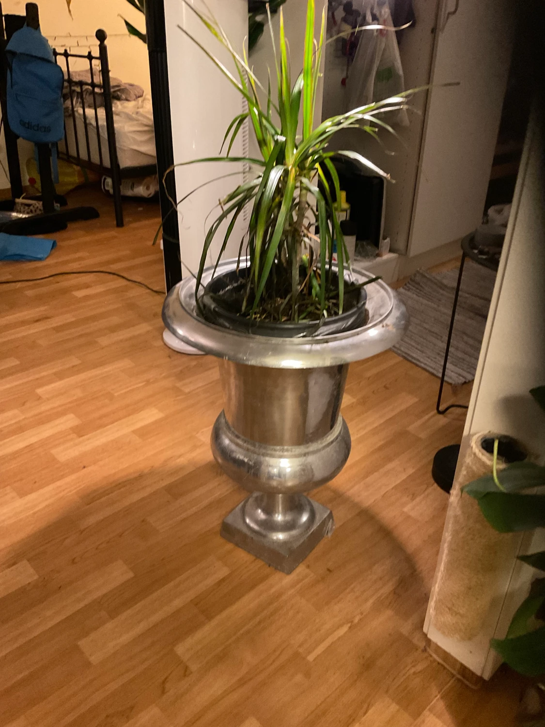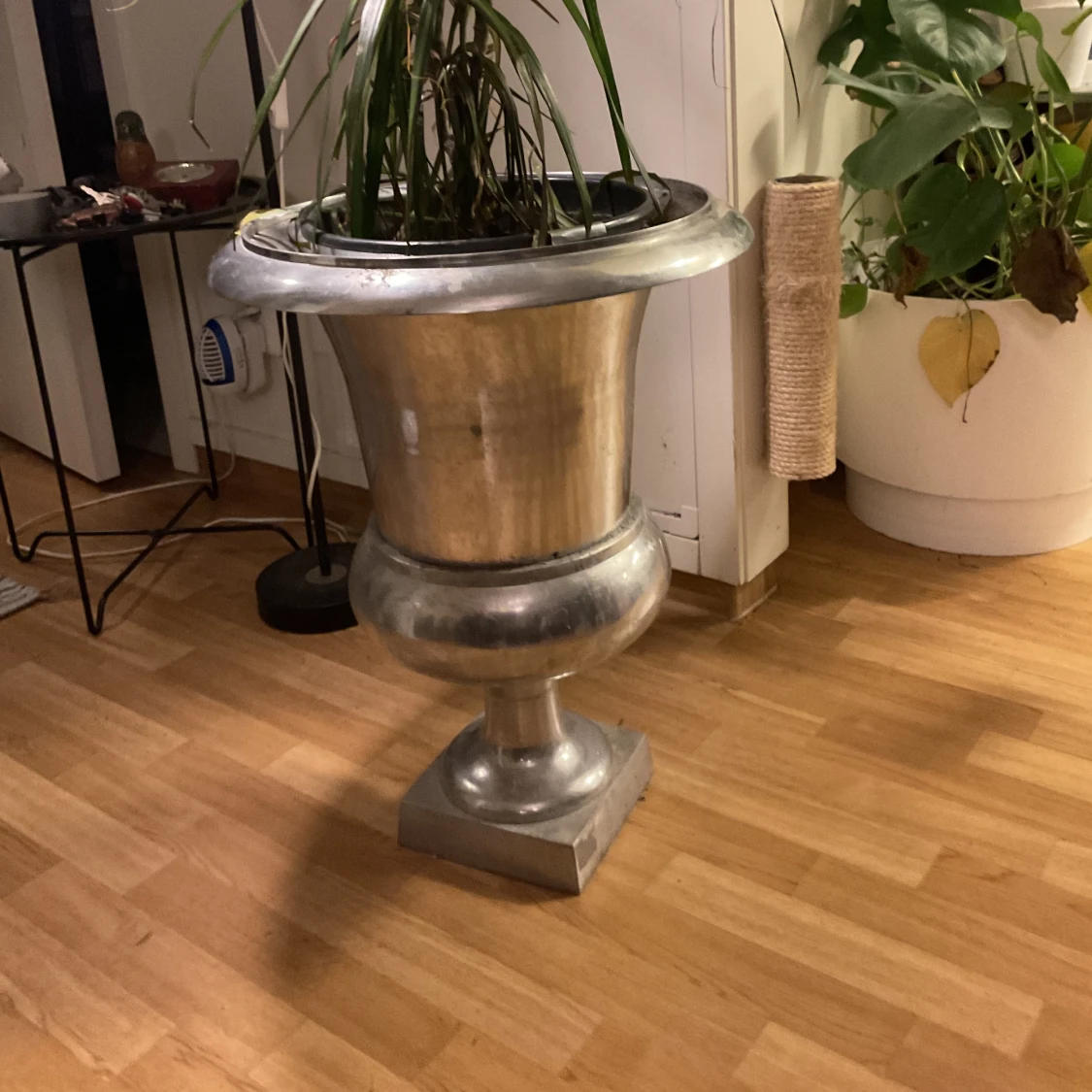 Stor rymlig fin silverfärgad kruka väger en del. Vad det är för material. Så har jag ingen annan inte kollat upp,