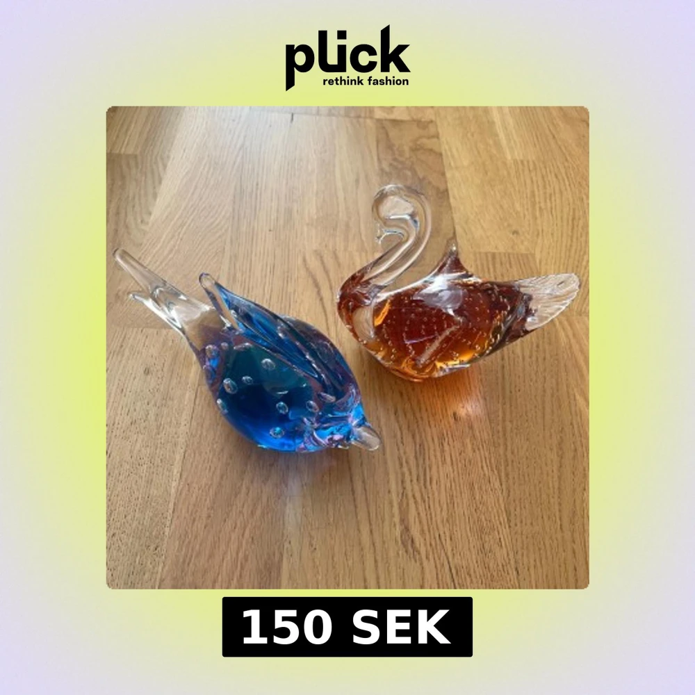 Säljer två färgglada glasfigurer i form av fåglar, en blå och en orange. De är konstfullt utformade med bubblor inuti glaset och passar perfekt som dekoration för dig som gillar unika detaljer.