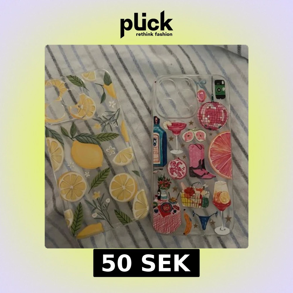 Säljer två mobilskal med unika motiv! Ett har citroner och blommor i gult och grönt, det andra har collage med rosa cowboyboots, drinkar, frukt och discokula. De passar perfekt till sommaren. För IPhone 13 Pro!