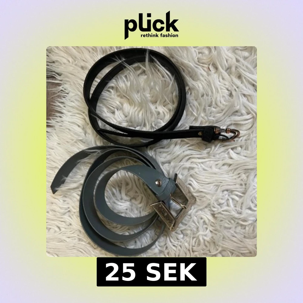 Säljer två snygga bälten: ett svart smalt bälte med kopparfärgat spänne och ett ljusblått bälte med ett fyrkantig silverspänne. Perfekta accessoarer för att lyfta din outfit med coola detaljer och stilrena färger.