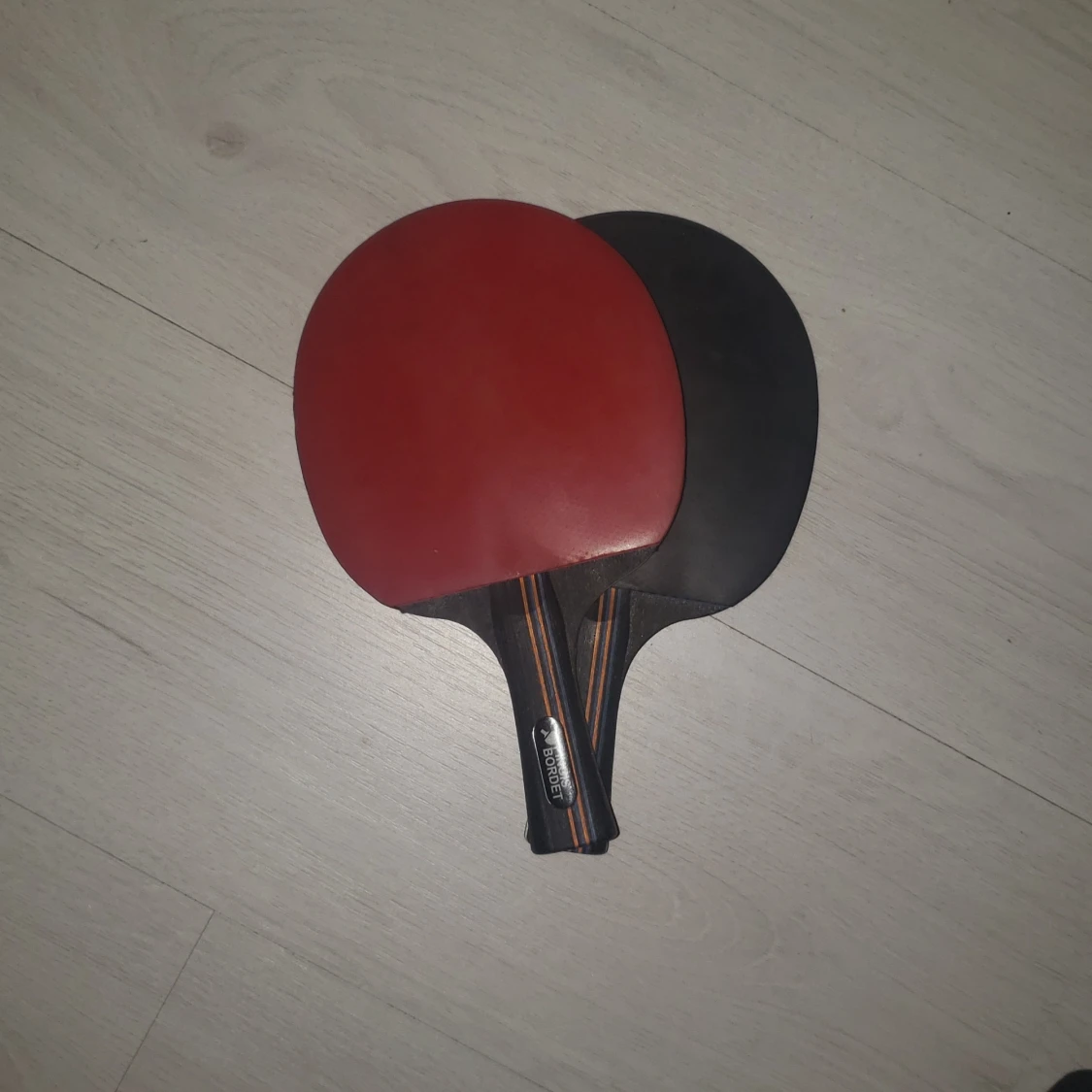 Säljer ett par pingisracketar Ena sidan är röd och den andra är svart. Perfekt för både nybörjare och erfarna spelare som vill ha bra kontroll och grepp. Köp dem och förbättra ditt spel! 🏓