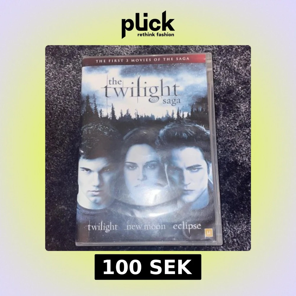 Säljer en DVD-box med de tre första filmerna i The Twilight Saga: Twilight, New Moon och Eclipse. Boxen innehåller tre skivor med omslag och motiv från filmerna. Perfekt för dig som gillar romantiska thrillers och vampyrer.