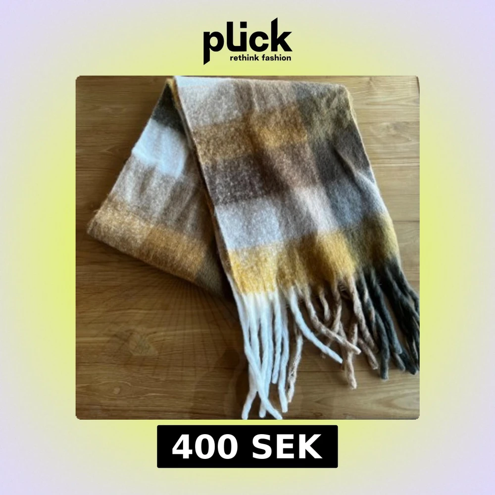 Mjuk och fluffig halsduk med rutigt mönster i brunt, beige, vitt och gult (liknande acne studios). Långa fransar i ändarna ger en avslappnad vibe. Perfekt att svepa runt halsen för extra värme under kyliga dagar. 240cm i längd, och 40cm bred.