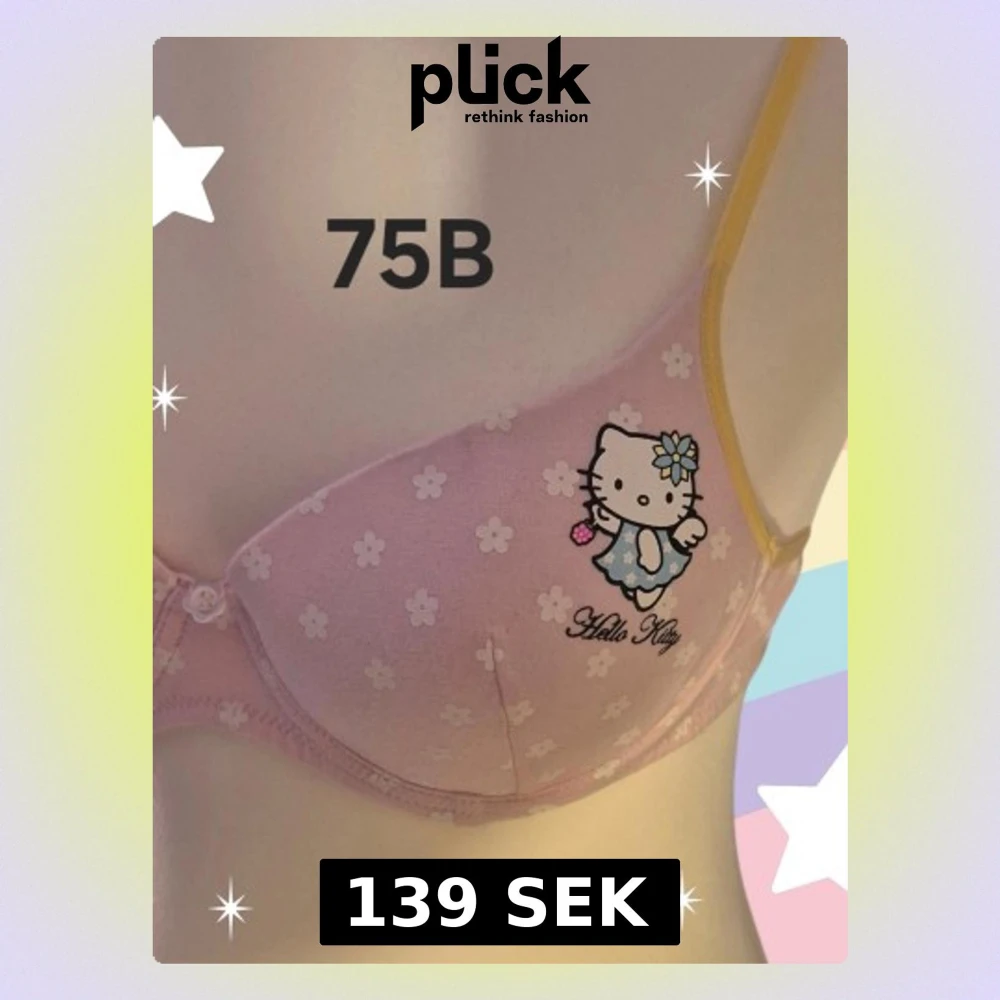 Supersöt rosa bh med vita små blommor och Hello Kitty-tryck på ena kupan. Smala gula axelband och mjuk bomullskänsla. Perfekt för dig som gillar gulliga detaljer och vill ha något unikt från Sanrio. Varan är oanvänd och kommer från ett konkurslager från 2000-talet. Har fler annonser och bra bundlerabatt vid köp av flera.
