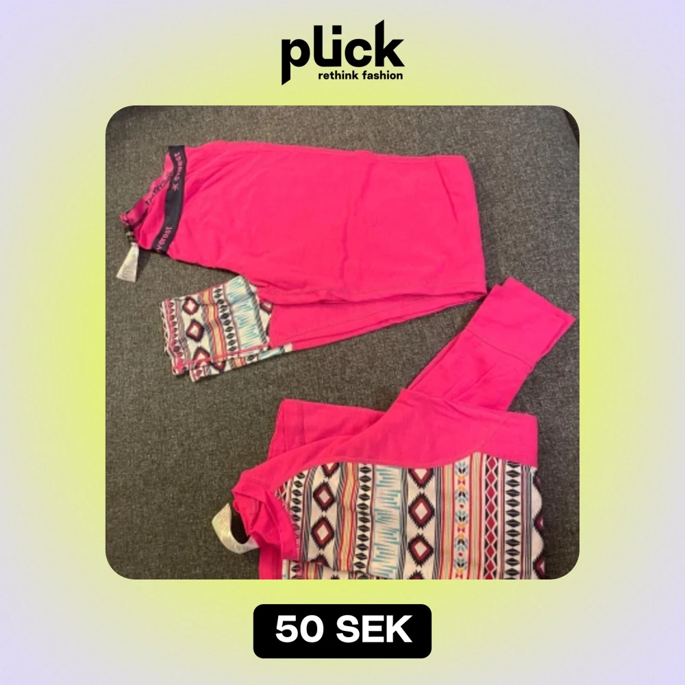 Snygg underställströja och byxor i rosa med mönster i vitt, svart, blått och rött. Tröja i storlek 36, byxor i storlek 38