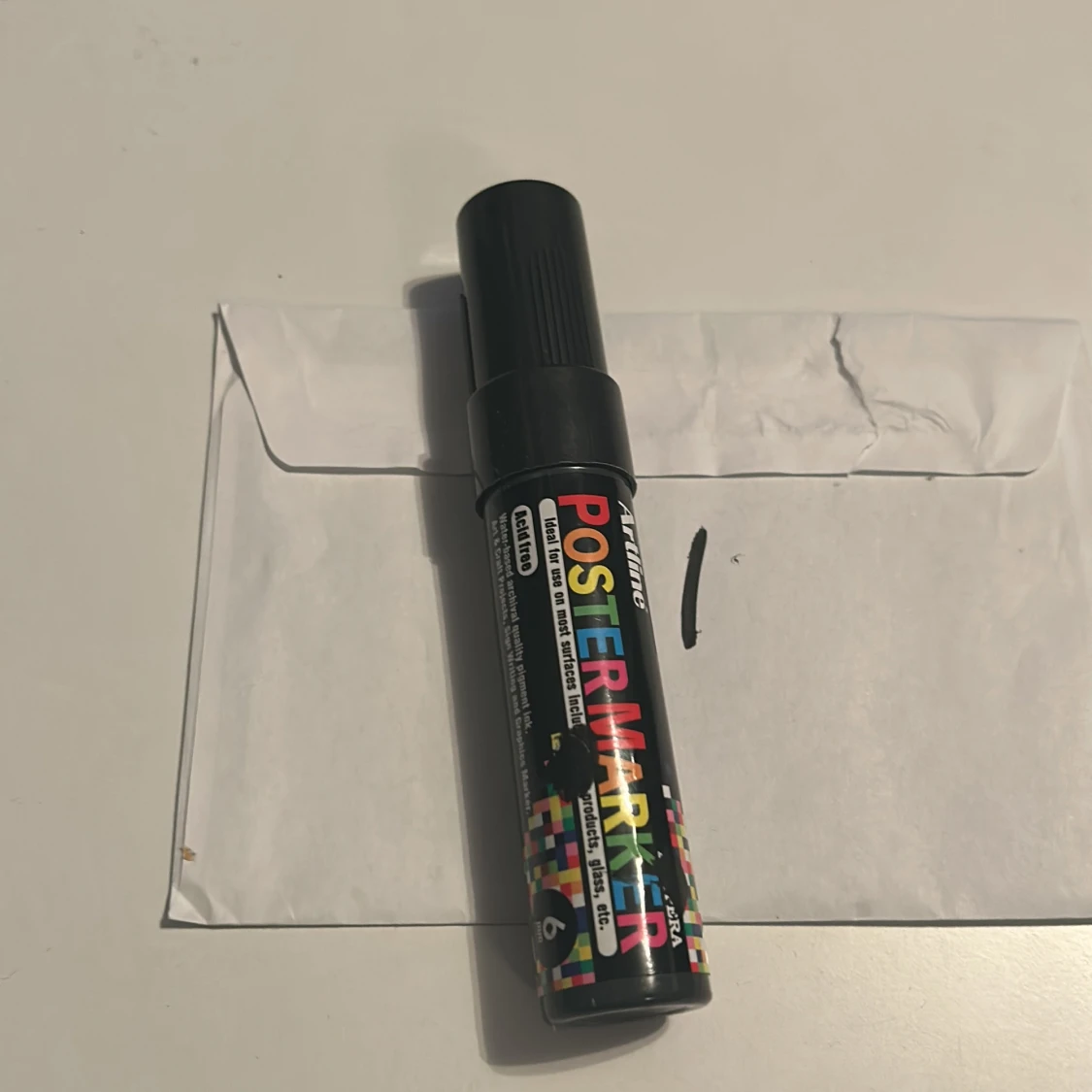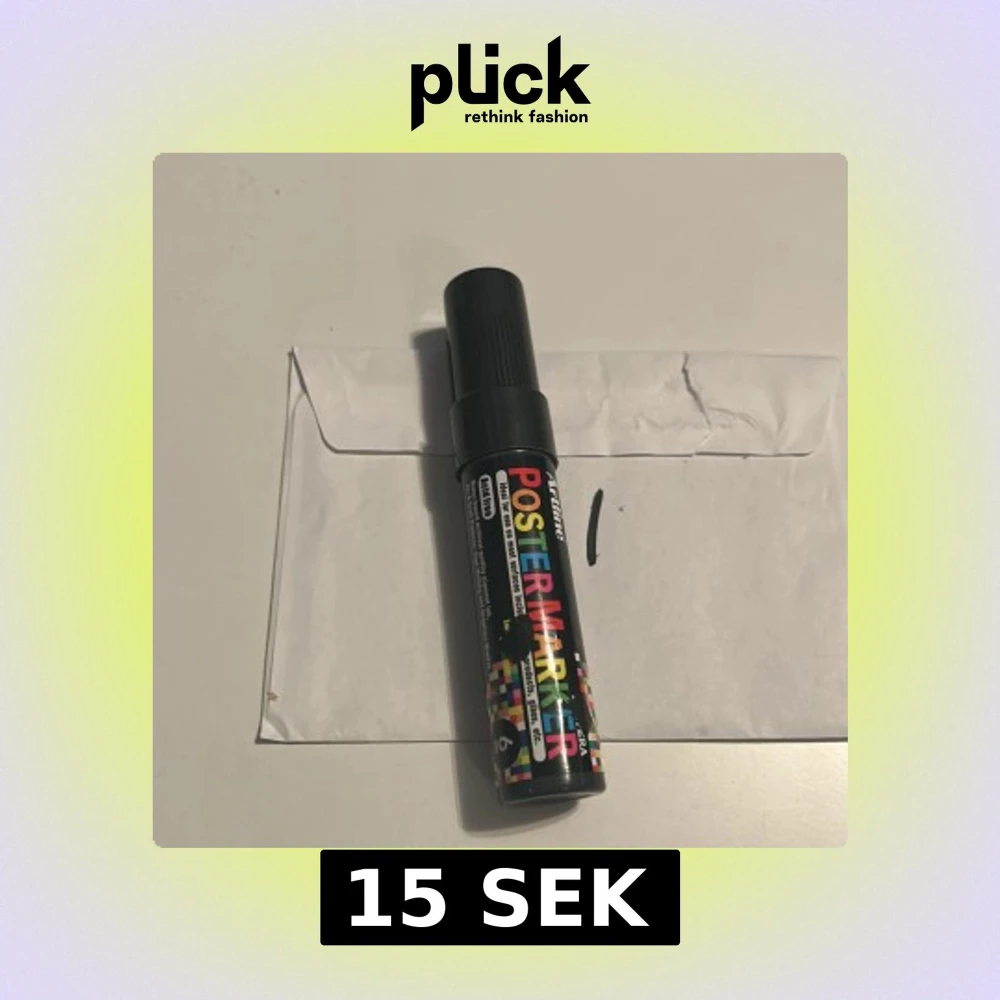 Säljer en svart Poster Marker från Uni med en 6 mm spets. Perfekt för att skapa tydliga och djärva linjer på olika ytor. Pennan är vattenbaserad och idealisk för konst och skyltar. Locket är svart och pennan har en färgglad etikett.