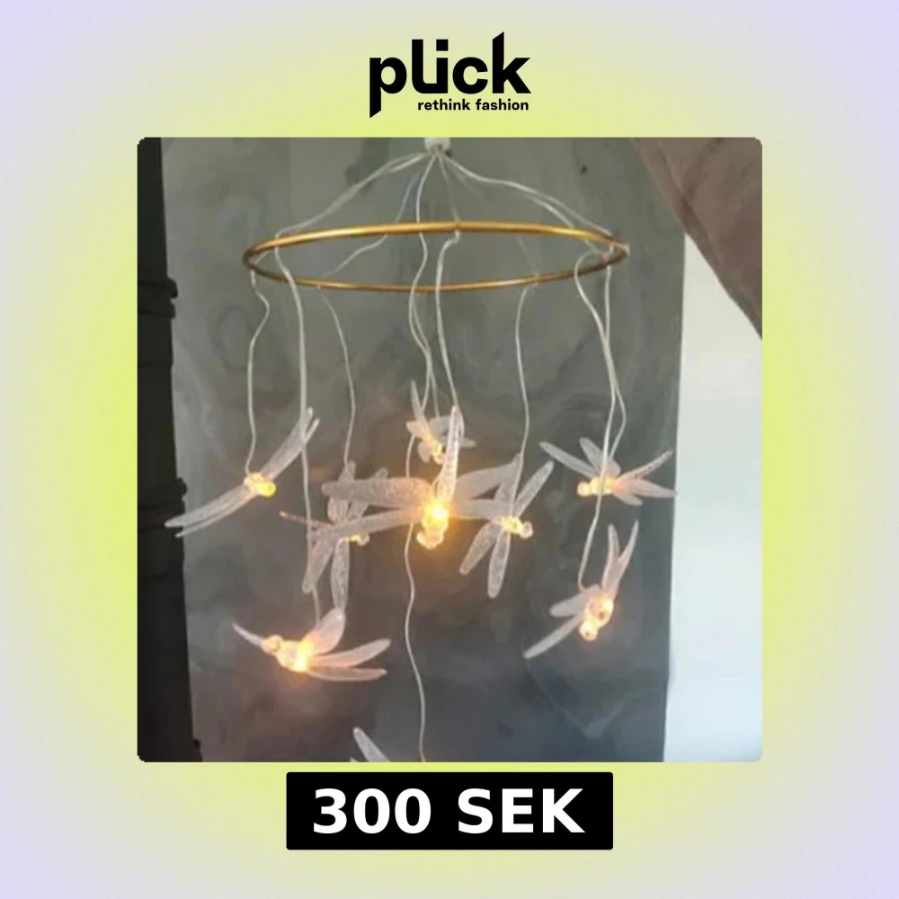 Unik ljusslinga från SKINA med transparenta trollsländor som hänger från en rund guldfärgad ring. LED-lampor i sländorna ger ett mysigt sken. Perfekt som dekoration i sovrum eller vardagsrum. Säljes i originalförpackning.
