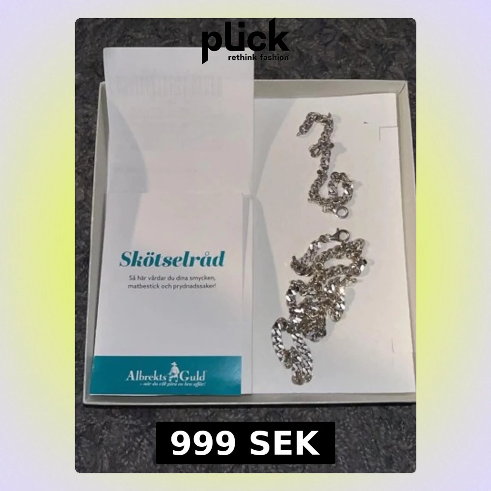 Halsband + armband i silver till salu. De köptes 2022 på albrektsguld, men de har inte använts på år. Men det är äkta så inget har hänt dem. De kommer med kvitto också, ordinarie pris är 1598kr men jag fick dem lite billigare. Armbandet är 19cm och halsbandet är 48cm. Hör av er i dem för intresse!