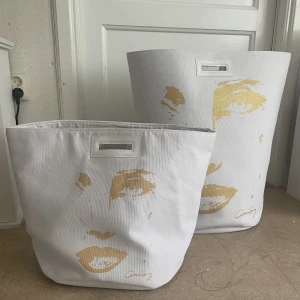 Carolina Gynning förvaringskorg liten & stor i vit och guld. Liten: 40x40 cm nypris 500kr Stor 60x40 cm nypris 600kr Priset avser båda två tillsammans. Vill ni endast köpa en av dom skriv vilken och prisförslag.