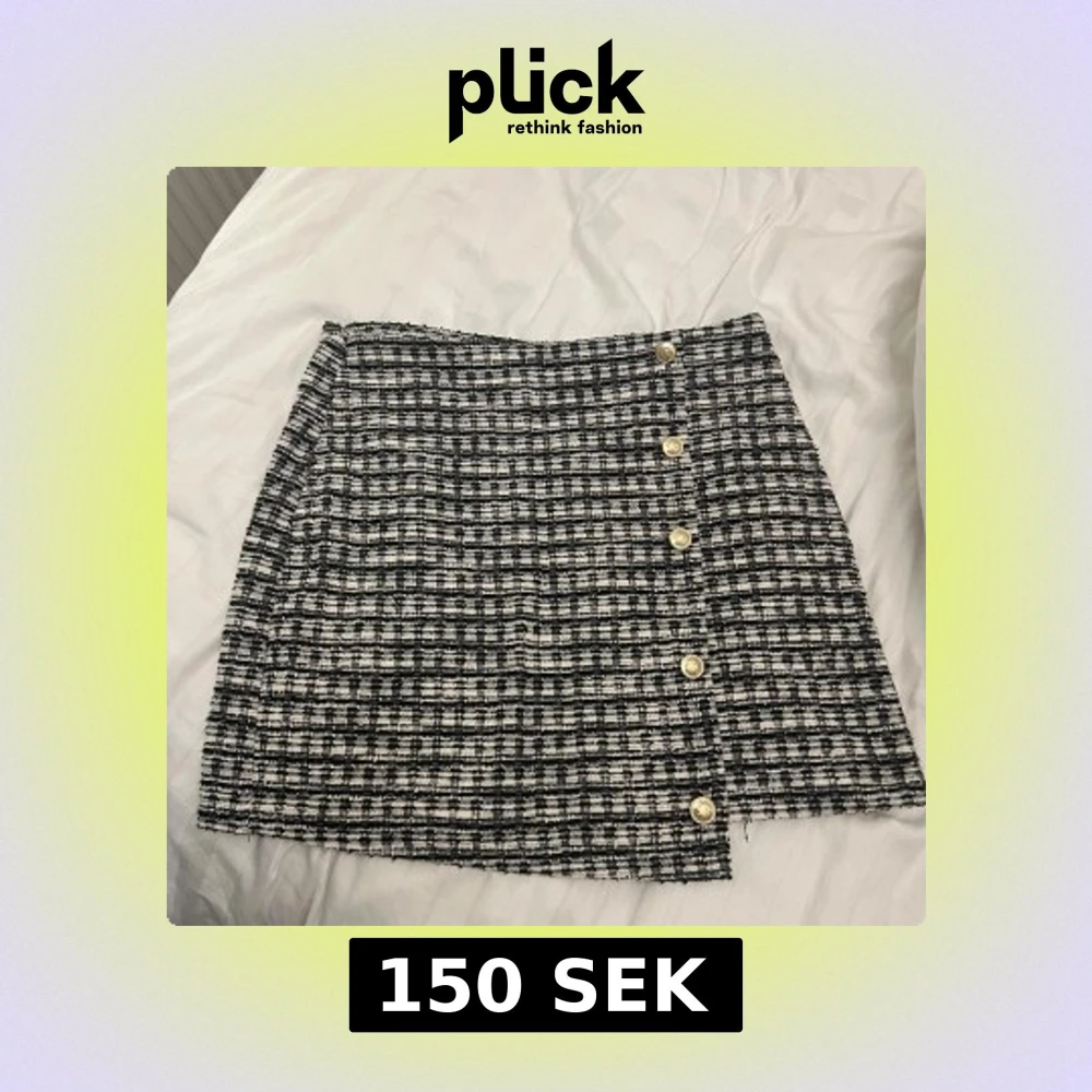 Säljer en svartvit rutig kortkjol från Vero Moda med snygga guldknappar längs framsidan. Kjolen har en klassisk A-linjeform och är tillverkad i ett strukturerat tyg som ger en trendig look.
