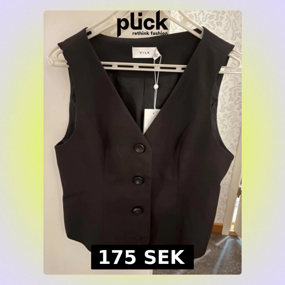 Stilren svart väst från VILA med djup v-ringning och fyra stora knappar framtill. Västen har en klassisk, figurnära passform och är tillverkad i ett slätt material som ger en snygg look. Perfekt att styla över en skjorta eller t-shirt.