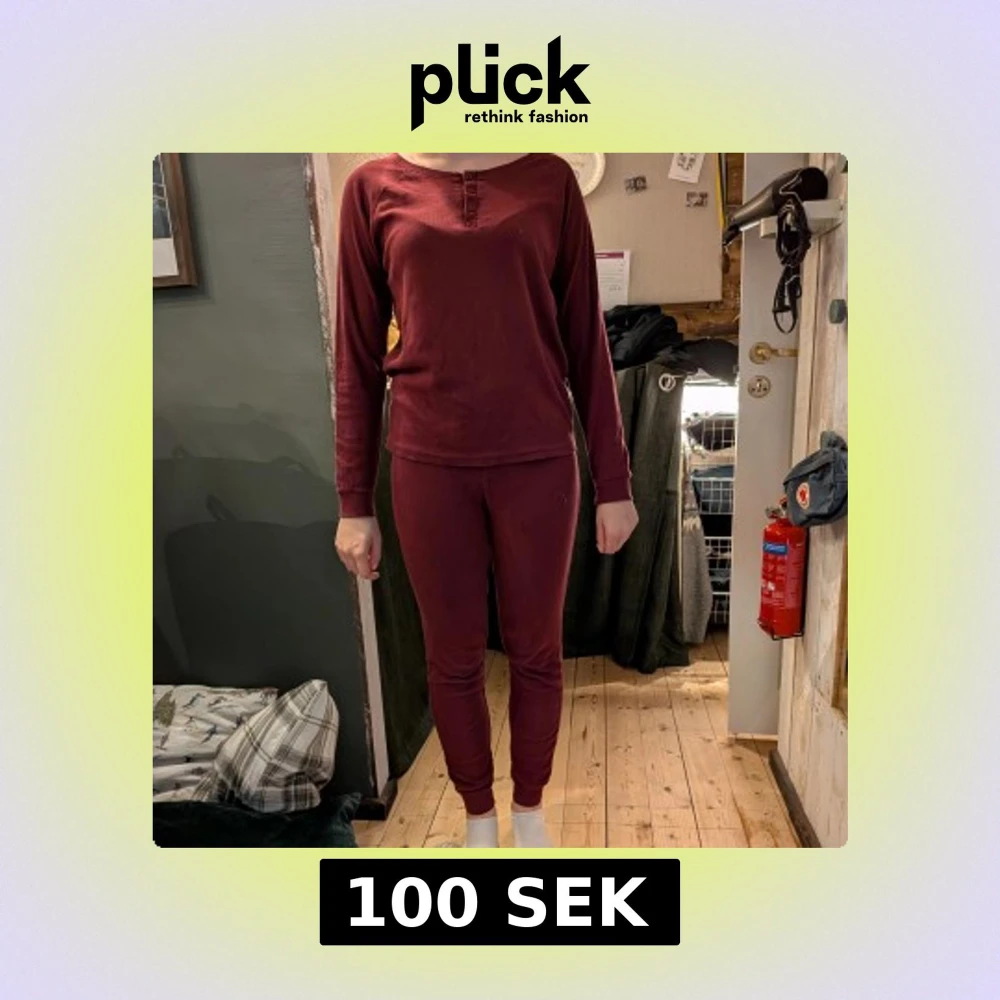Det är en vinröd pyjamas i stretchingt material i storlek 170 men ut töjd lite gran den är ribbad med 3 knappar som går att öppna.väldigt bra sick inte andvända så mycket från HM Den säljs som ett sätt