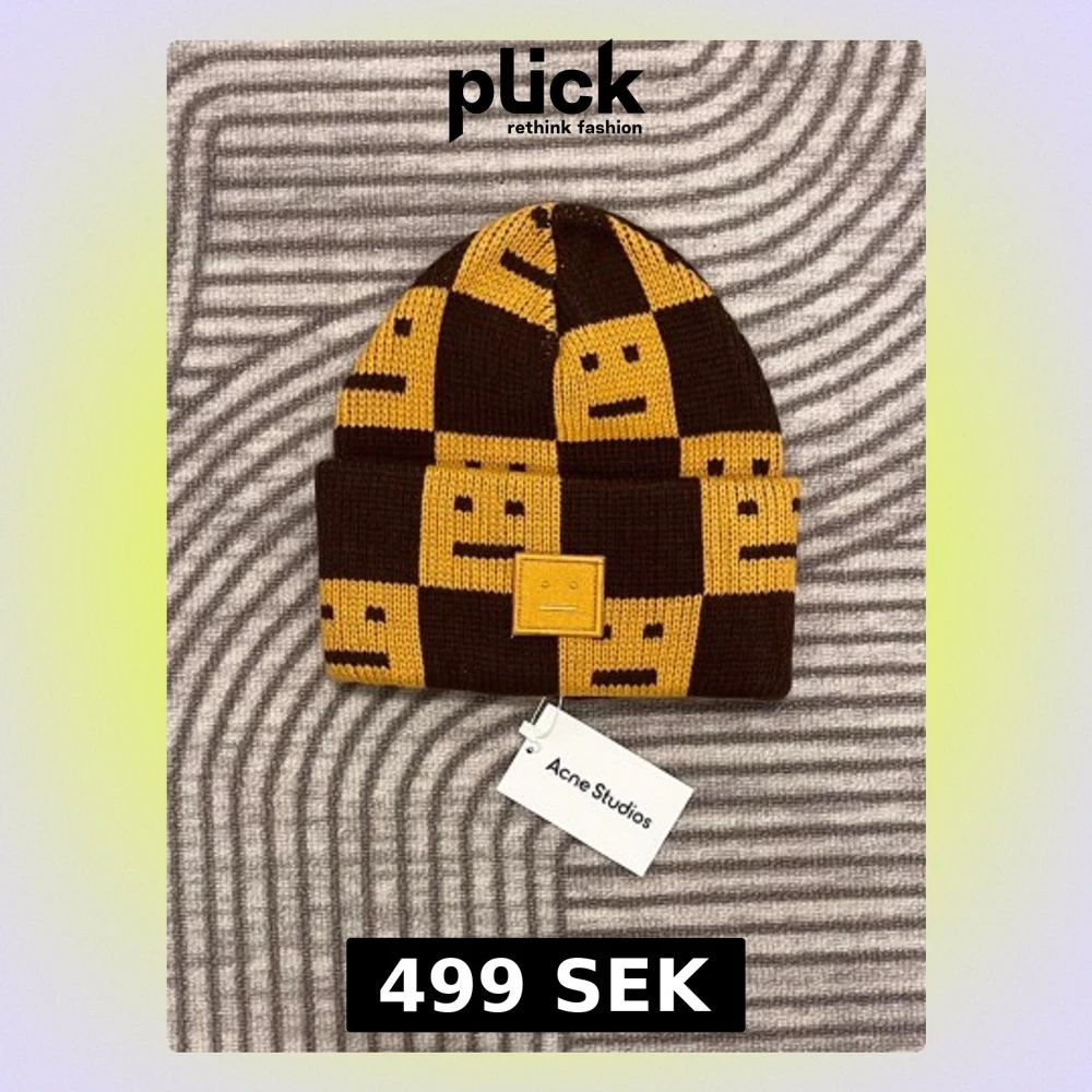 Mössa från acne studios - Säljer en stickad mössa från Acne Studios med det ikoniska ansiktsloggan framtill. Mössan är ribbstickad och gjord i 100% ull, vilket gör den både varm och snygg. Perfekt accessoar för att lyfta din outfit under kyliga dagar.