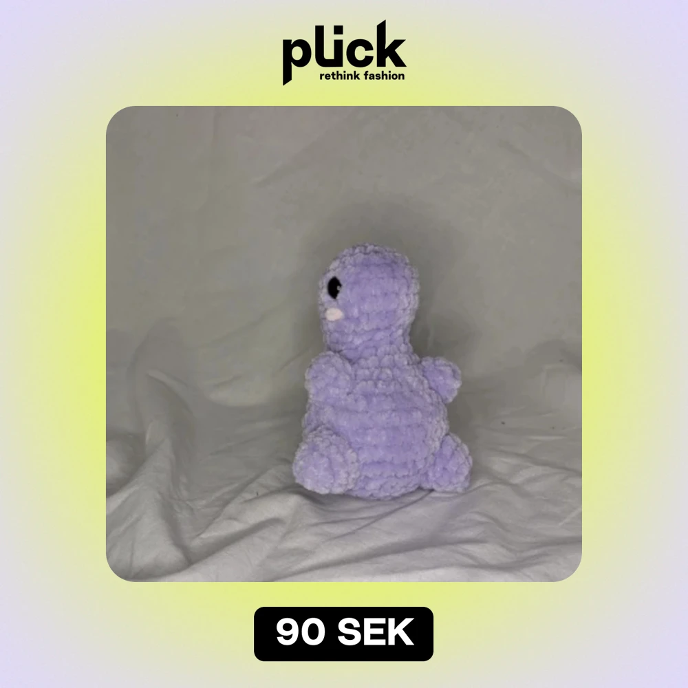 Höjd: 13cm Bred: 10cm Det är en egenvirkad dino som är gjord på fluffigt garn som är 100% polyester