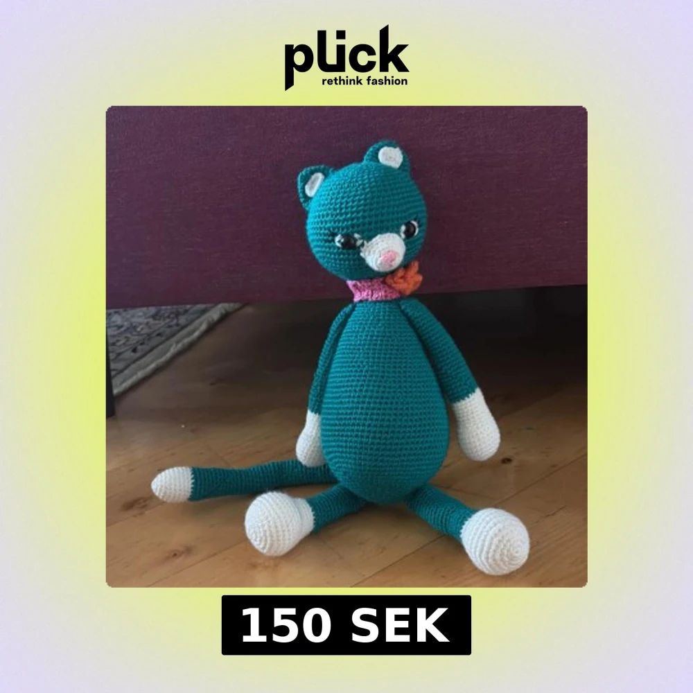 Säljer en handgjord virkad katt i turkos med vita tassar, nos och öron. Katten har svarta ögon, rosa nos och bär en rosa och orange virkad blomma runt halsen. Perfekt som present eller dekoration.