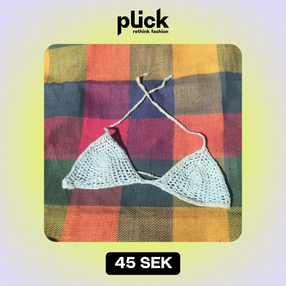 En ljusblå virkad bikiniöverdel med knytband runt halsen och ryggen. Överdelen har en triangelformad design och är handgjord av mig med ett öppet virkmönster. .