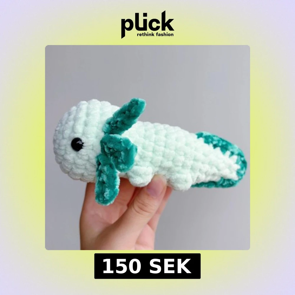 Grön virkad axolotl – handgjord & unik💚🧶 Superfin, mjuk och söt liten axolotl i grön, perfekt som present eller för att ge lite extra charm till hyllan, soffan eller skrivbordet! • Handgjord med kärlek 💚 • Virkad i mjukt garn • Ca 17-18cm lång • Unik – bara ett exemplar! ✨ Pris: 150 kr ✨ Passar både som prydnad och kramdjur 🧸OBS! Dessa innehåller säkerhetsögon som ej är rekommenderade för barn under 3 år!