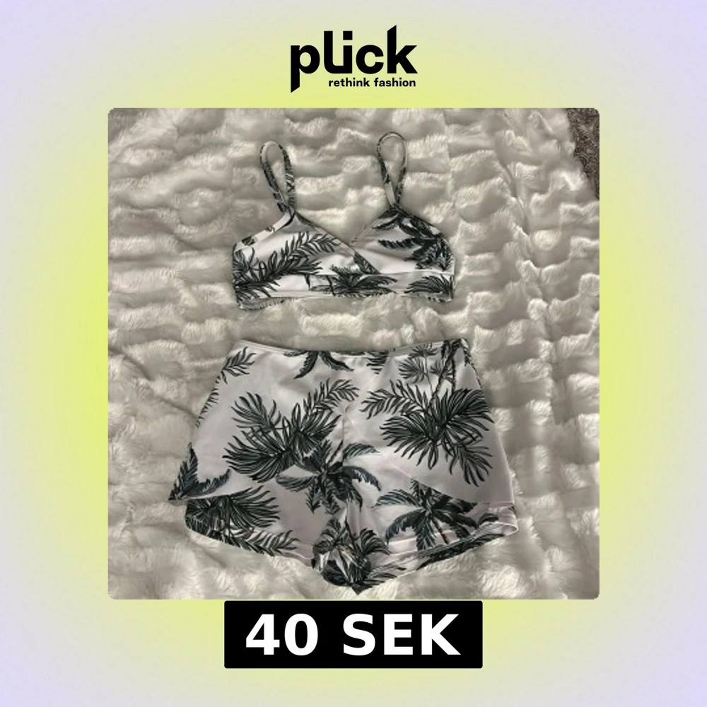 Snygg bikini med vit bas och grönt palmbladsmönster. Toppen har smala axelband och byxorna är höga med shortsmodell för extra komfort. Perfekt för strandhäng och poolparty. Materialet känns som syntet, vilket torkar snabbt och är bekvämt att bära. Justerbara axlar och går att sätta in inlägg ifall man vill. Storlek xxs men ingen lapp på. Från shein men den är som en helt vanling bikini!
