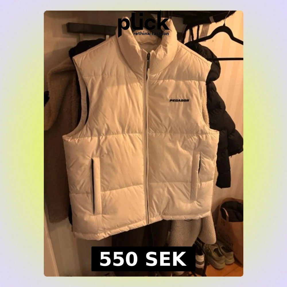 Säljer en stilren vit dunväst från Pegador i storlek L. Västen har hög krage, två sidofickor med dragkedja och ett quiltat mönster. Materialet är polyester och den har en snygg Pegador-logga på bröstet. Perfekt för lager-på-lager och streetwear. Använd en gång!
