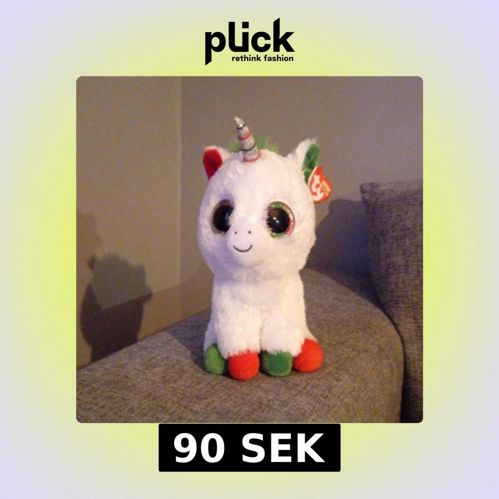 Supergulligt gosedjur i form av en vit enhörning från Ty med stora glittriga ögon, röd och grön man samt silverfärgat horn. Fötterna är röda och gröna. Perfekt för dig som älskar mjukdjur och magiska varelser.