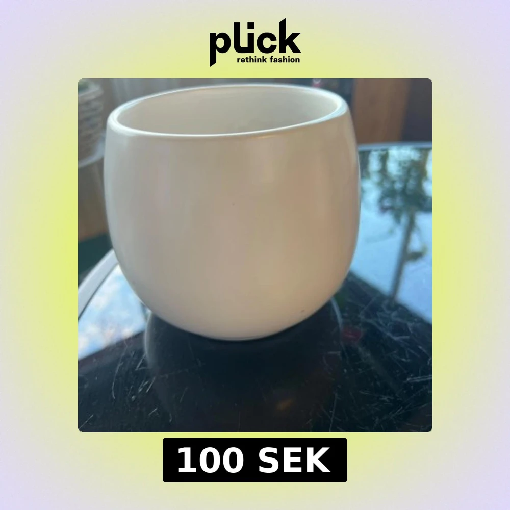 Bilderna visar en vit, rund kruka eller kopp i keramik med enkel och stilren design.