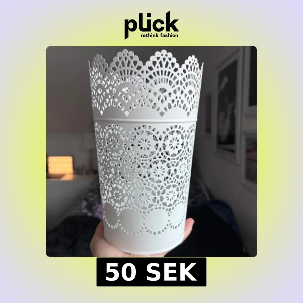 Säljer en elegant vit kruka från IKEA med ett vackert spetsmönster. Perfekt som dekoration eller förvaring. Den har en rund form och är tillverkad i metall. Passar fint i fönstret eller på hyllan för att ge rummet en stilren touch. Säljs pga att den aldrig kommit till användning ☺️