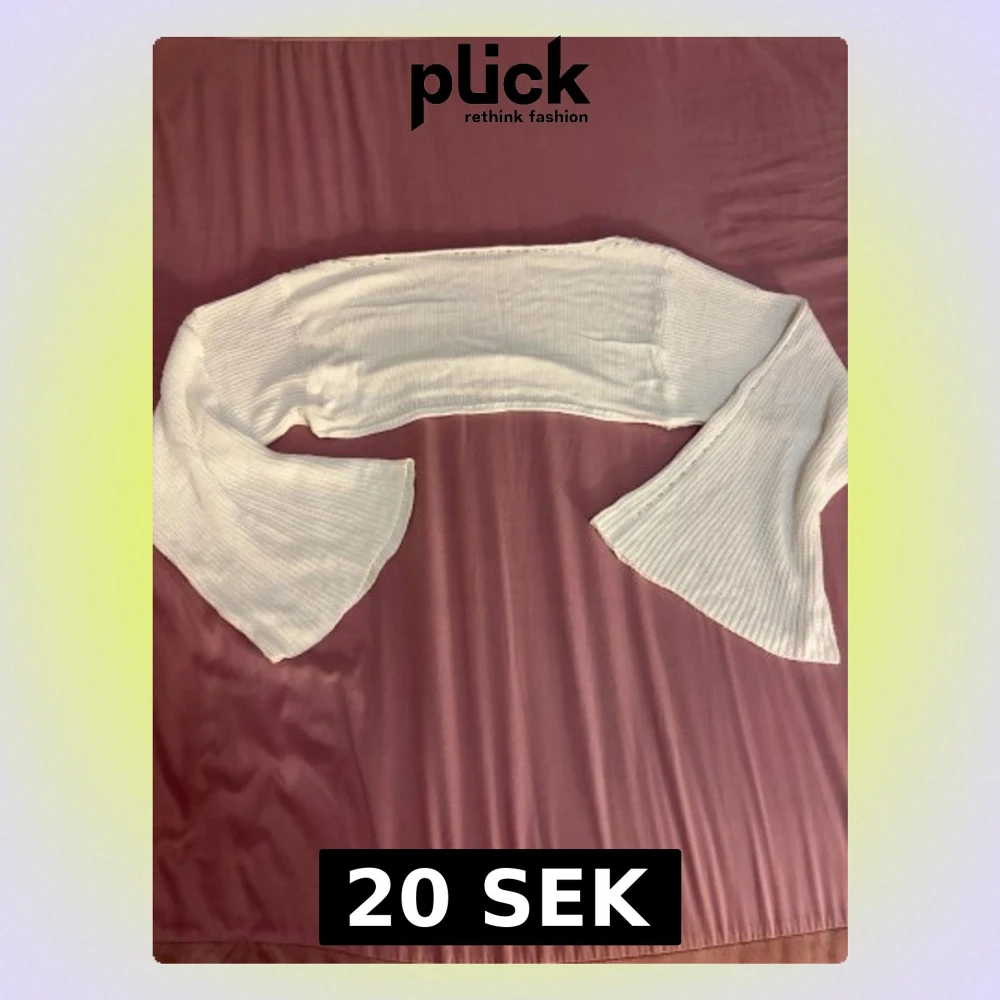 Säljer en vit stickad topp med breda, utsvängda ändar. Toppen är ribbstickad och har en mjuk, skön känsla som passar perfekt när du vill ha den över ett linne t.e.x. Enkel och stilren design som funkar till många olika outfits.