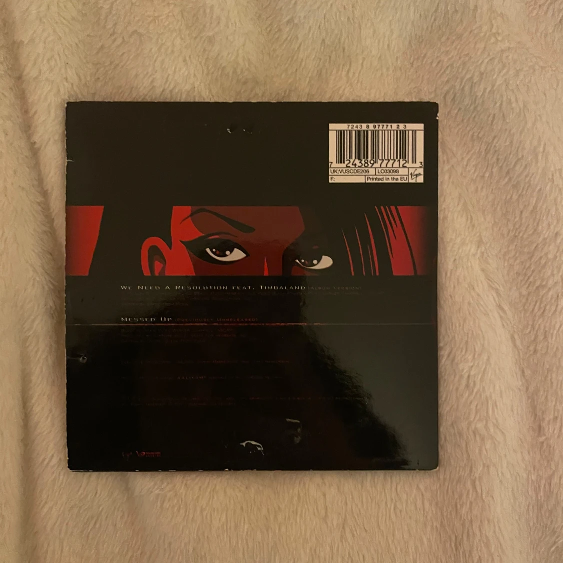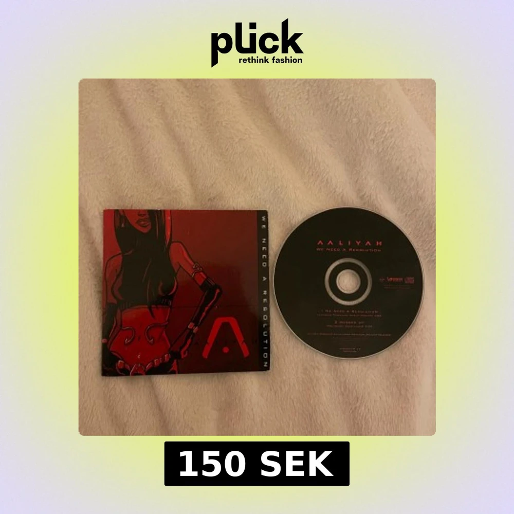 CD-singel av Aaliyah med titeln 'We Need a Resolution'. Omslaget är i rött och svart med en stiliserad illustration av en kvinna. Baksidan visar en närbild av ögon i samma färgtema. Perfekt för samlare av 2000-tals R&B-musik.