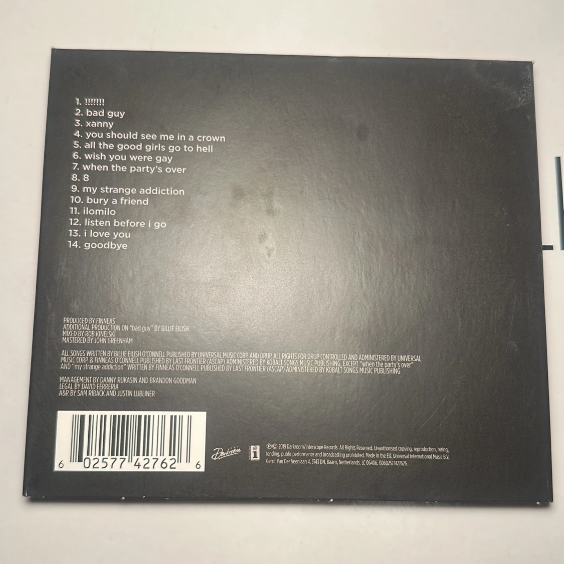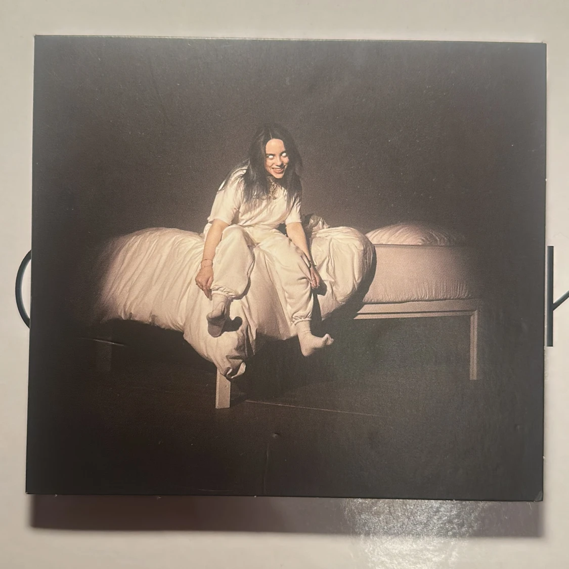CD-albumet 'When We All Fall Asleep, Where Do We Go?' av Billie Eilish. Innehåller låtar som 'bad guy', 'bury a friend' och 'when the party's over'. Skivan är limegrön och kommer i ett fodral med låttexter tryckta på insidan. Ser inga tecken av rispor på CD skivan.