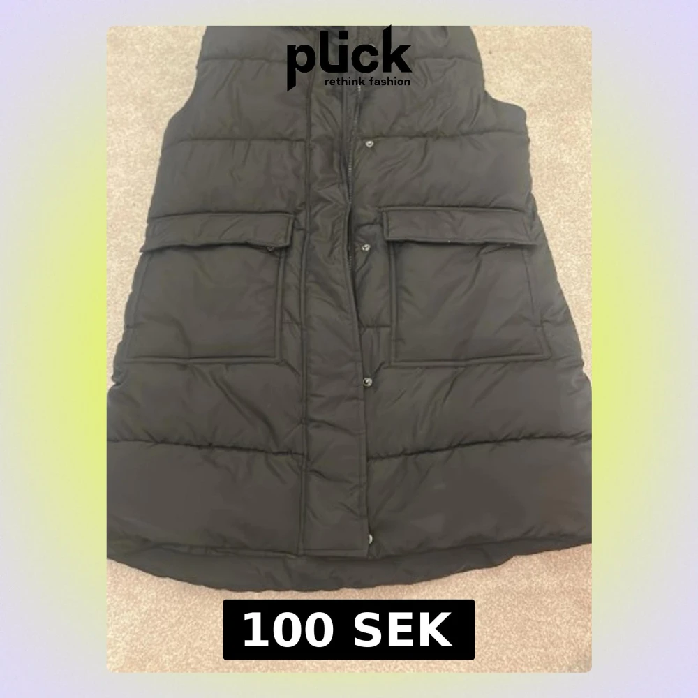 Säljer en svart, lång dunväst med stora fickor framtill och quiltad design. Västen har både dragkedja och knappar längs framsidan, vilket gör den extra praktisk. Perfekt att slänga över en hoodie eller tröja när det är kyligt ute.