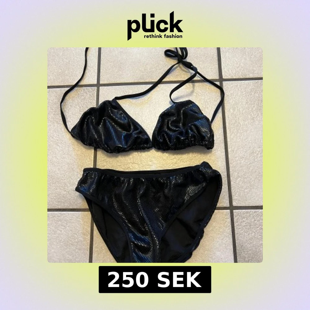 Snygg svart bikini med glittrigt material och trekantsöverdel med knyt i nacken och ryggen. Underdelen har hög midja och samma glittriga finish. Perfekt för dig som vill sticka ut på stranden. Storlek XS/S