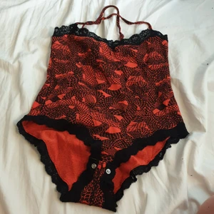 En röd och svart body med spets. Banden är korsade i ryggen. Strl xs. Köparen står för frakt.