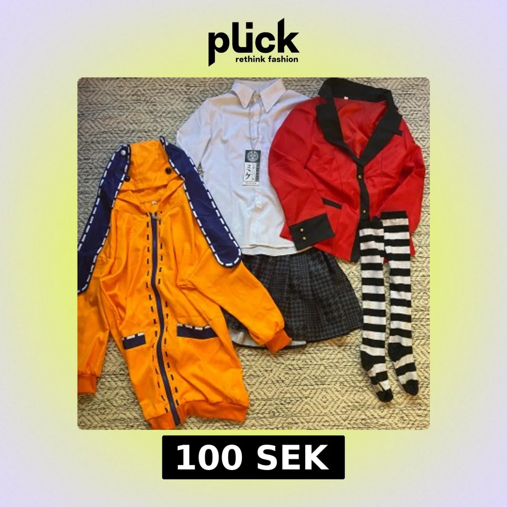Säljer Runa yomozuki cosplay från serien Kakegurui. Det storlek S men skulle räkna det som xxs. Koftan har lite vattenskador men är inte så synliga.