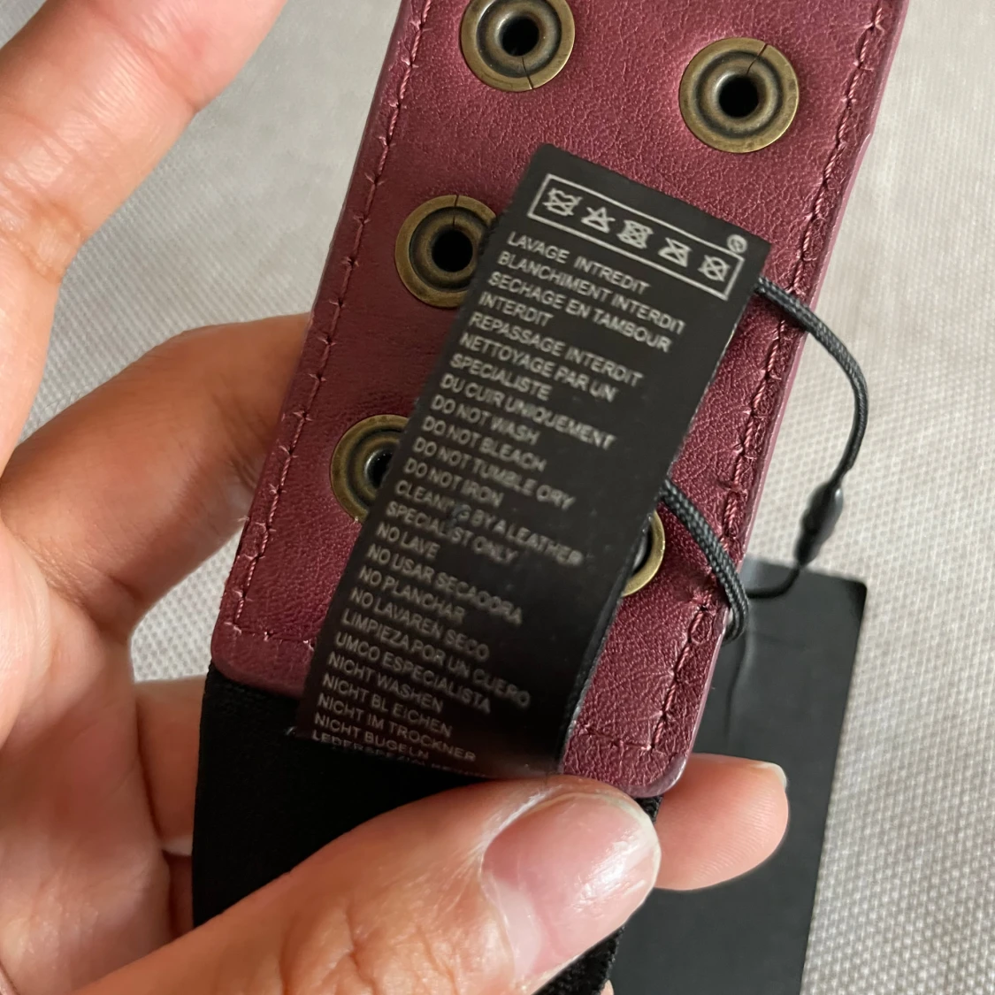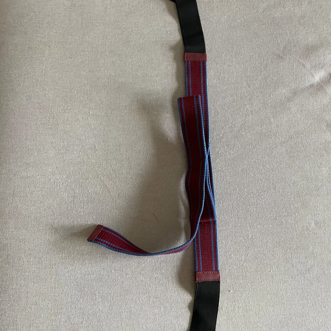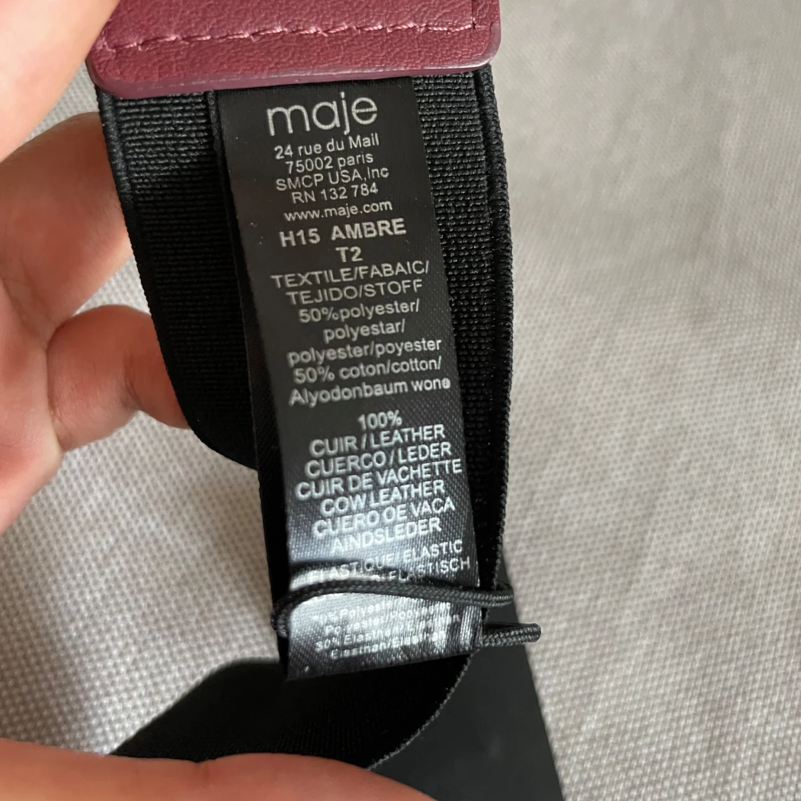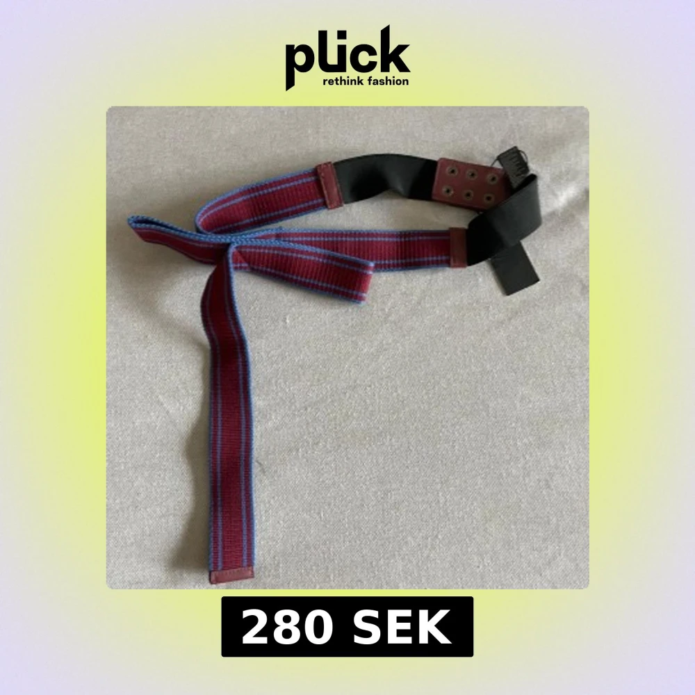 Snyggt bälte från Maje i vinrött med blå ränder och svarta detaljer. Bältet har läderdetaljer och metallöljetter. Perfekt accessoar för att lyfta din outfit med en färgklick och cool design.