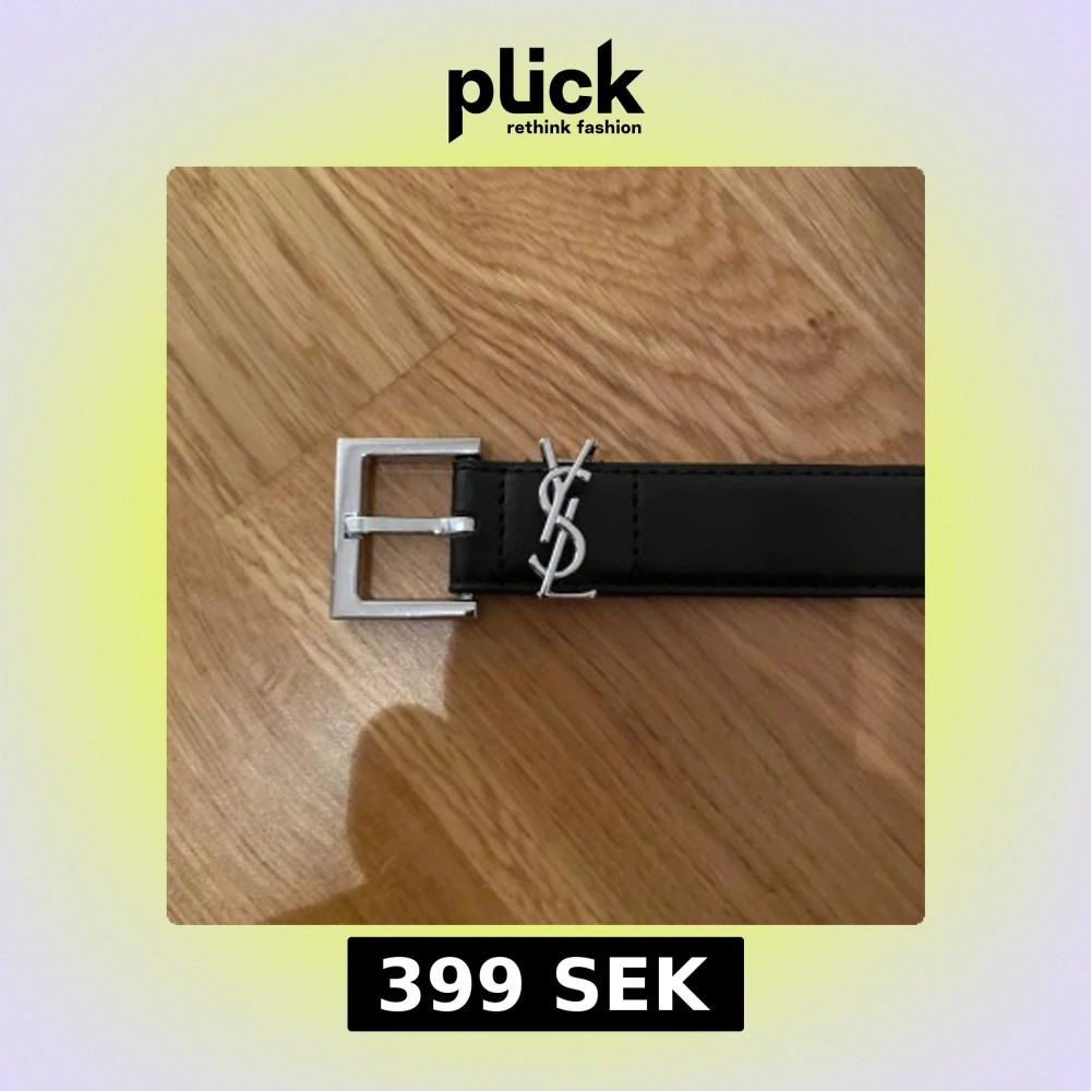 Säljer ett stilrent svart bälte från YSL med klassisk silverfärgad logga och spänne. Bältet är smalt och har en enkel, rak form som passar till jeans eller kostymbyxor. Materialet är skinn och detaljerna i metall ger en lyxig känsla.