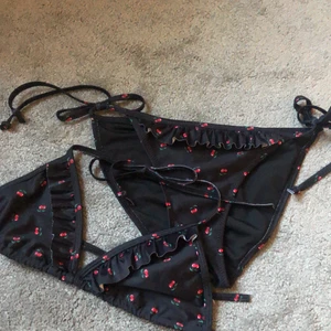 Säljer min bikini från Cubus som är svart med körsbär då den är för liten.💕 storlek 32/34 alltså xs men har band som går att knyta och är då juster bara.