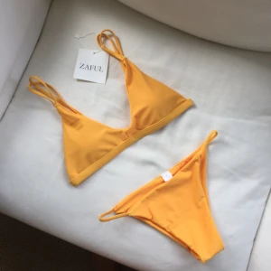 Gul/mangofärgad bikini från Zaful 🌷Märkt som M men liten i storleken så passar S/36. Bikinin är oanvänd och säljes på grund av fel storlek. Hör av er för fler bilder eller frågor :) Frakt +28 kr 🌸