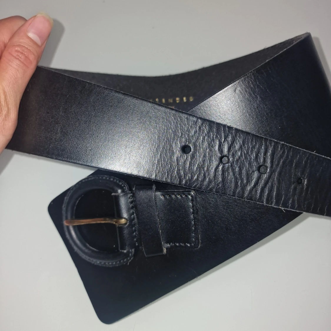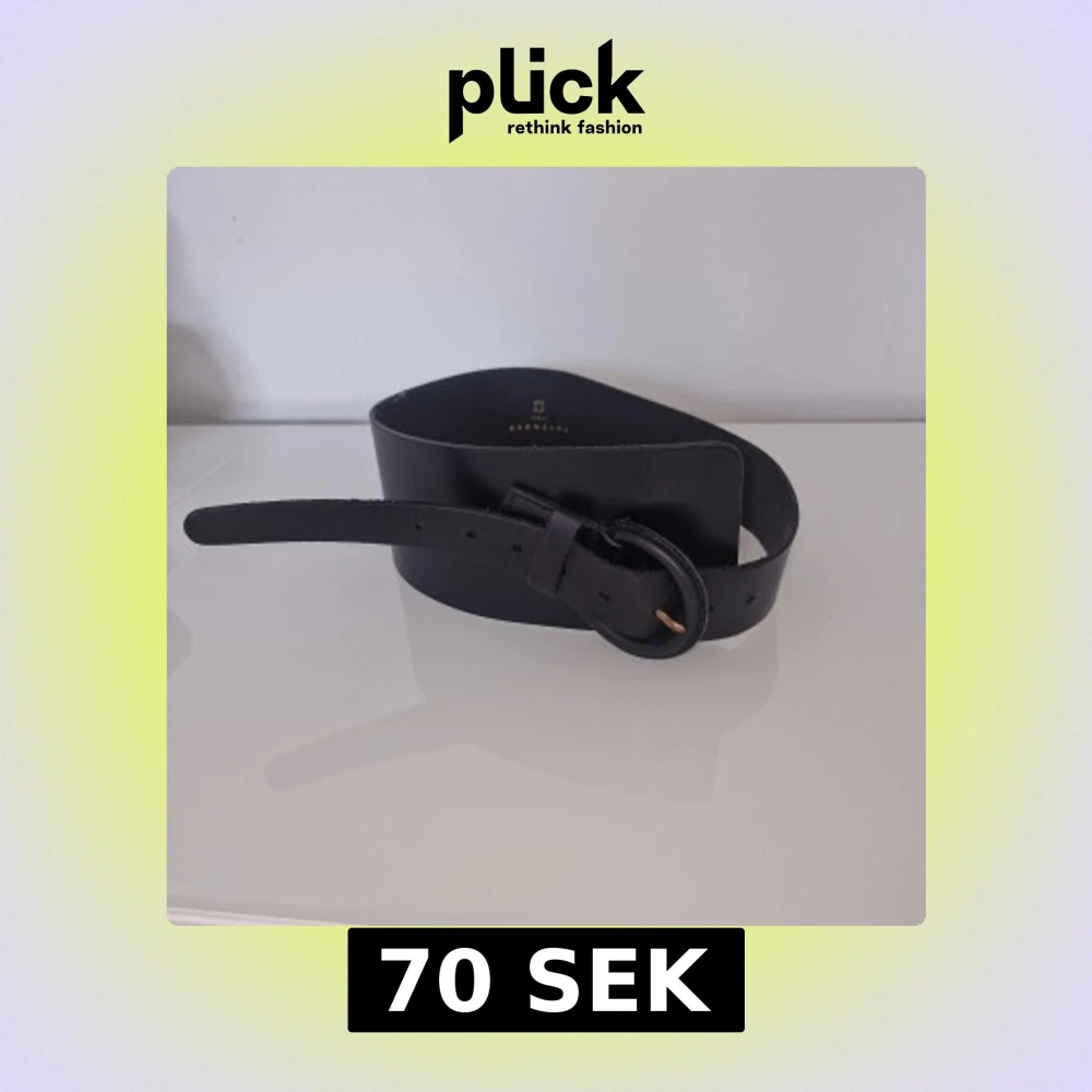 Snyggt svart bälte i äkta skinn. Bältet är brett och passar över skjortor/outfits för en stilren design.