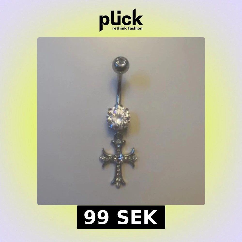 Snygg navelpiercing i silverfärgad metall med ett glittrigt kors hängande och stora strasstenar. Korset har flera små stenar som ger extra bling och cool detalj. Perfekt för dig som vill ha något som sticker ut och glänser.