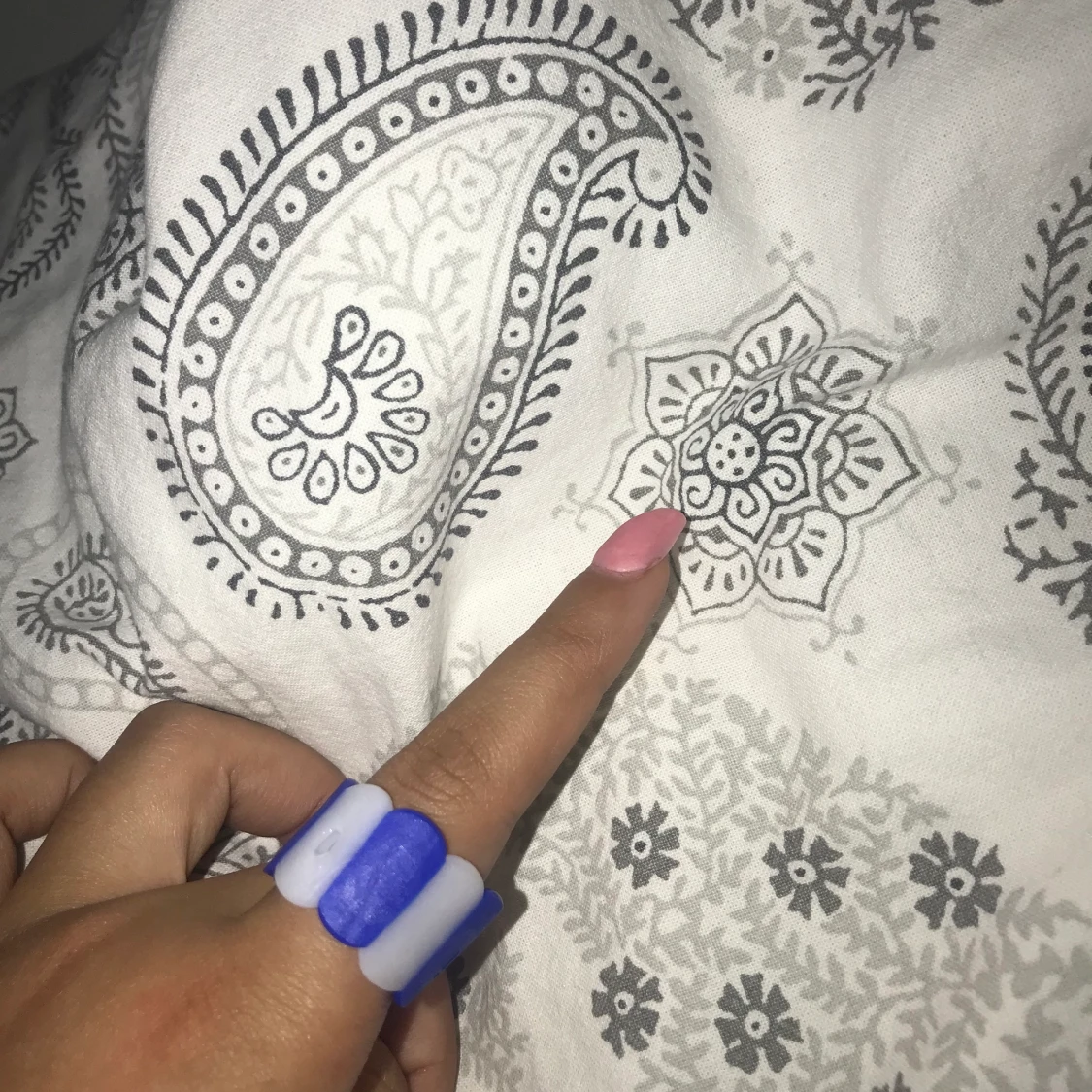 Jätte fin ring. Blå och vit, vet dock inte storleken på den men skulle gissa typ S/M