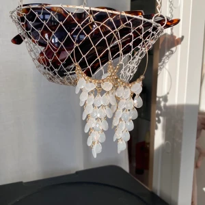 Örhängen guldfärgat med små plastprismor, alla smycken saniteras och rengörs innan dem säljs :)