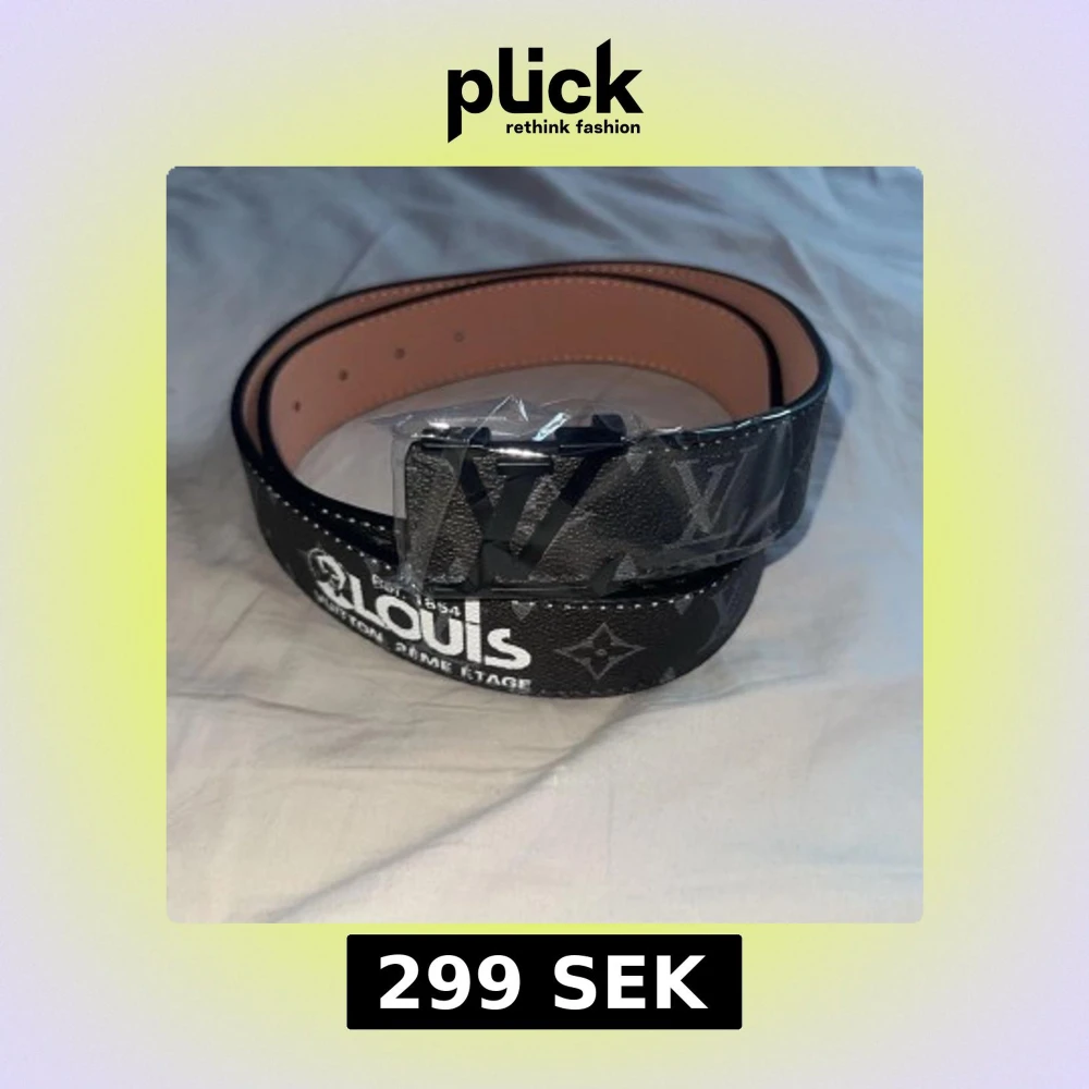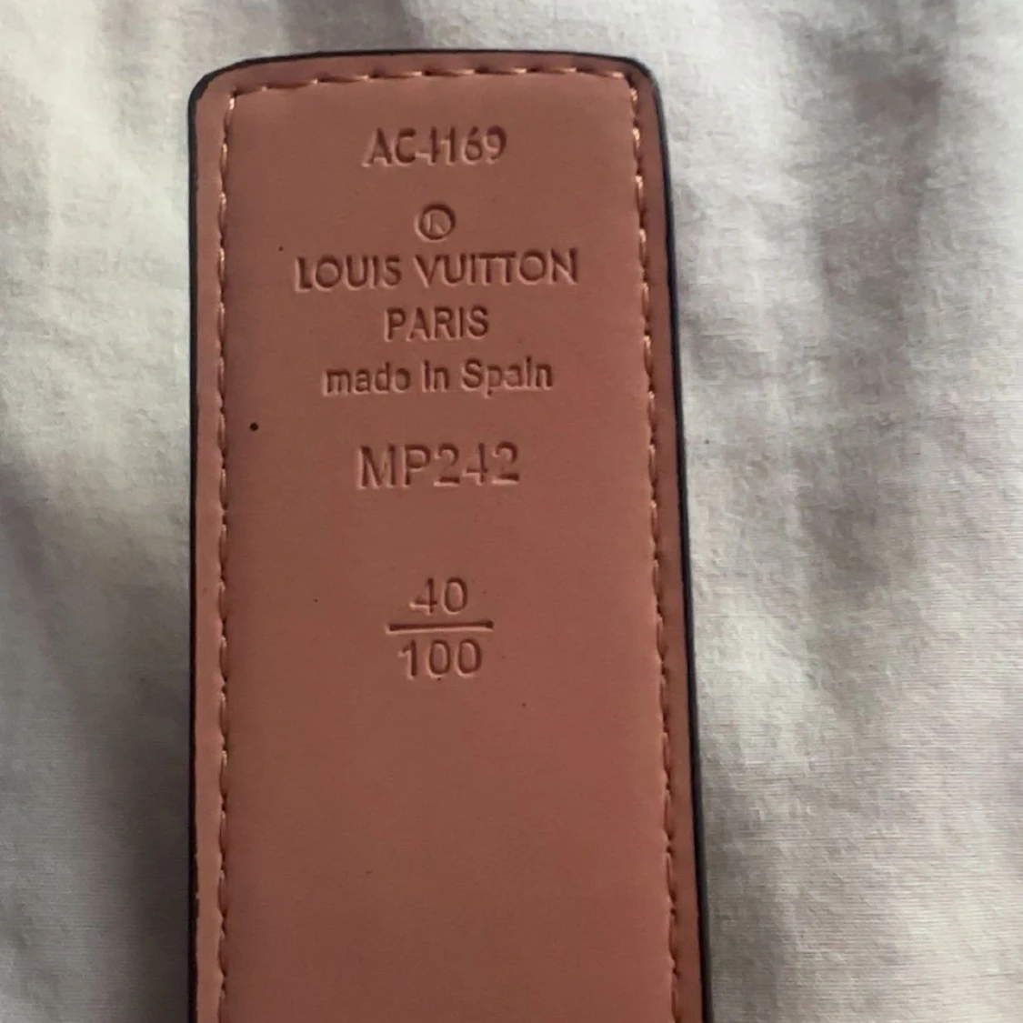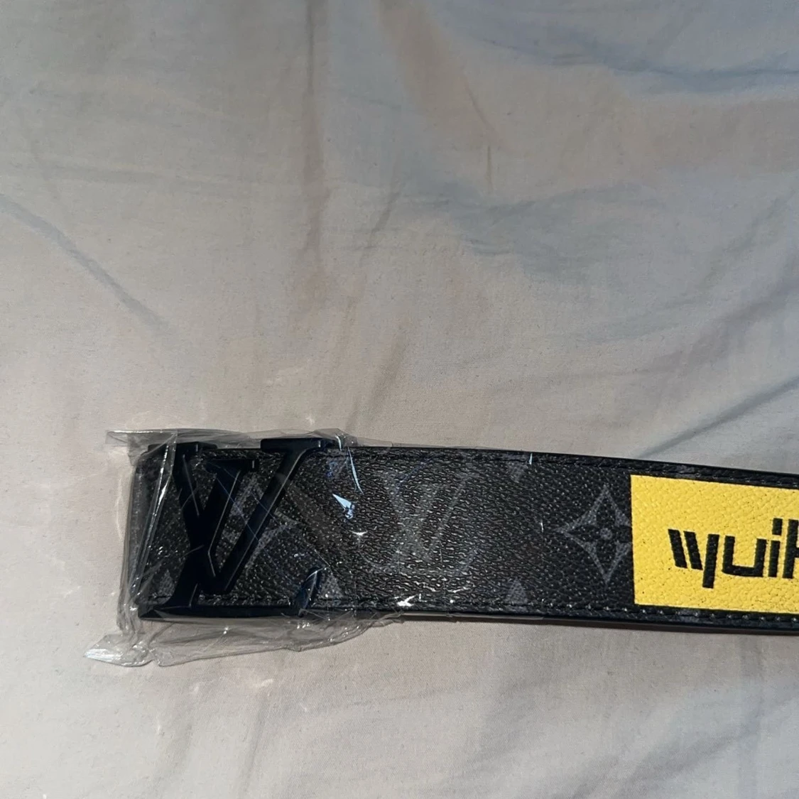Snyggt svart bälte i skinn med klassiskt monogrammönster och stor logga på spännet. Bältet har vita och gula detaljer samt präglad text på insidan. Perfekt accessoar för att lyfta din outfit.
