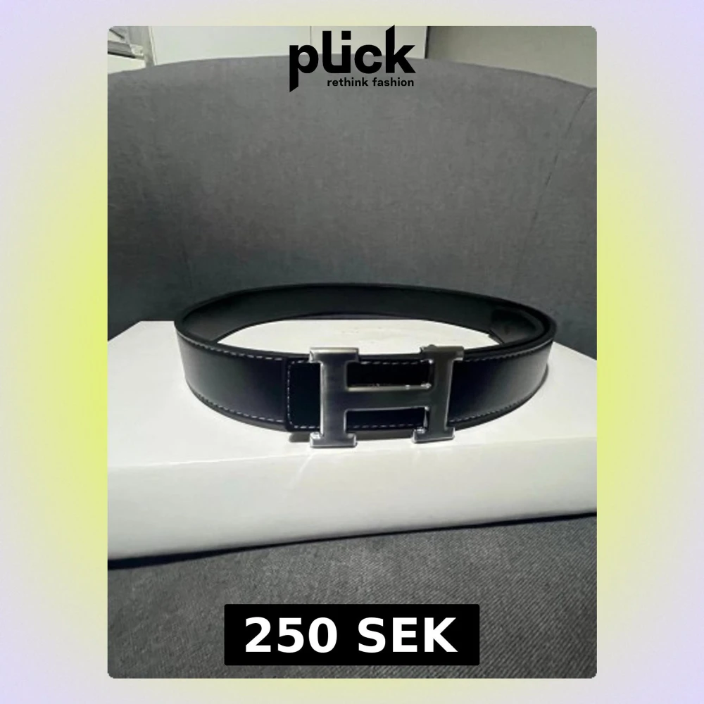 Snyggt svart skärp med en bred rem och ett stort, metalliskt H-format spänne. Skärpet har vita sömmar längs kanterna som ger en clean kontrast. Perfekt accessoar för att lyfta vilken outfit som helst.
