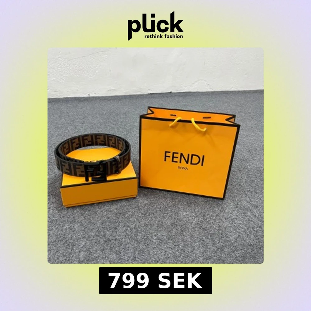 Snyggt Fendi-bälte i brunt och svart skinn med ikoniskt FF-monogram över hela bandet. Bältet har en bred, svart metallspänne formad som Fendi-loggan. Perfekt accessoar för att lyfta din outfit med lyxig känsla och streetstyle-vibe.
