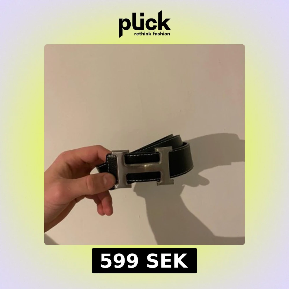 Säljer ett svart bälte i skinn med ett stort, stilrent H-spänne i silverfärgad metall. Bältet har vit kontrastsöm längs kanterna och en klassisk, rak form. Perfekt för dig som vill ha en lyxig och tidlös accessoar med statement-detalj.