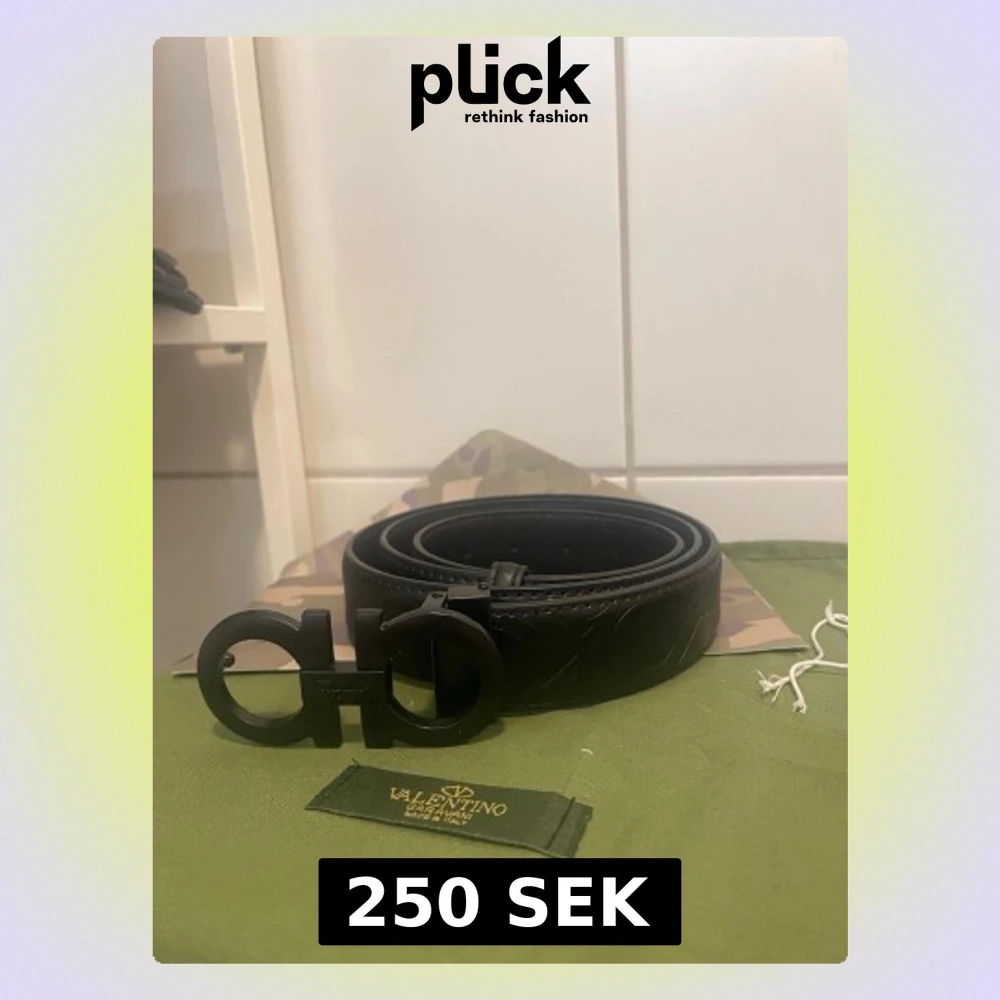 Bilderna visar ett svart bälte från Salvatore Ferragamo med en stor, rundad metallspänne och mönstrad läderrem. Ingen väst syns på bilderna.