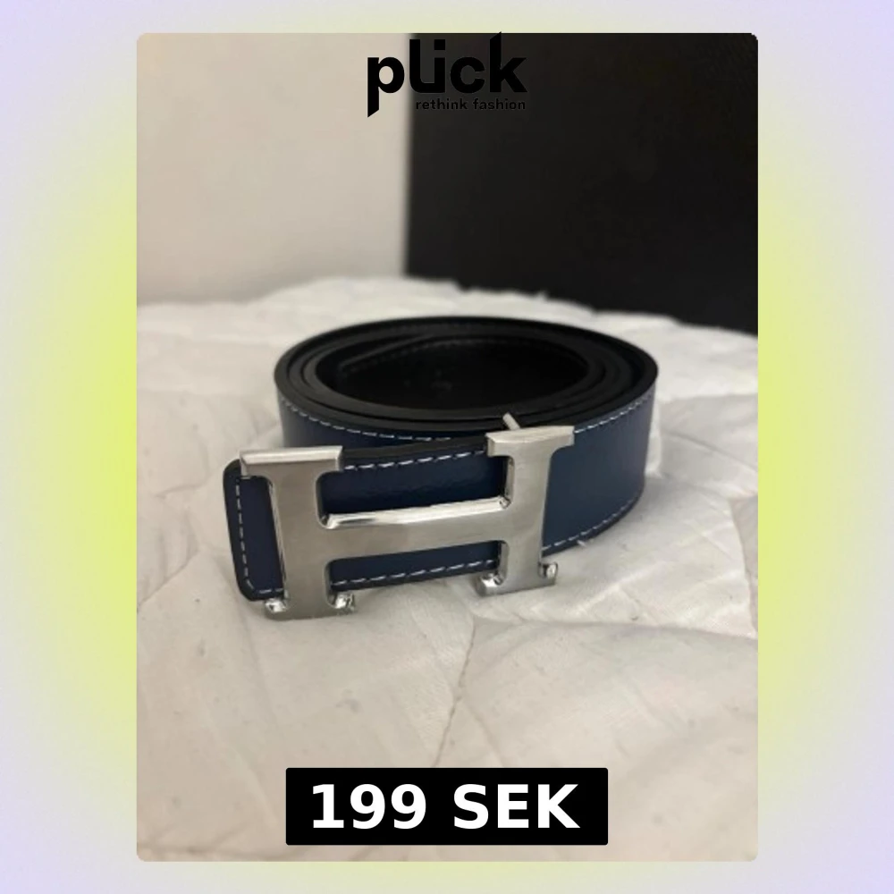 Jag säljer ett blått stiligt bälte med ett silver spänne. Bältet är 125 cm och kan vändas in och ut från blått till svart.