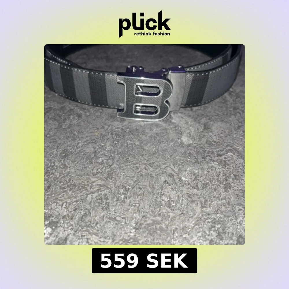 Snyggt svart bälte med breda, mörka ränder och ett stort metallspänne i form av bokstaven B. Bältet har en stilren design med tydliga sömmar och är gjort i ett tåligt material med läderlook. Perfekt accessoar för att lyfta din outfit.